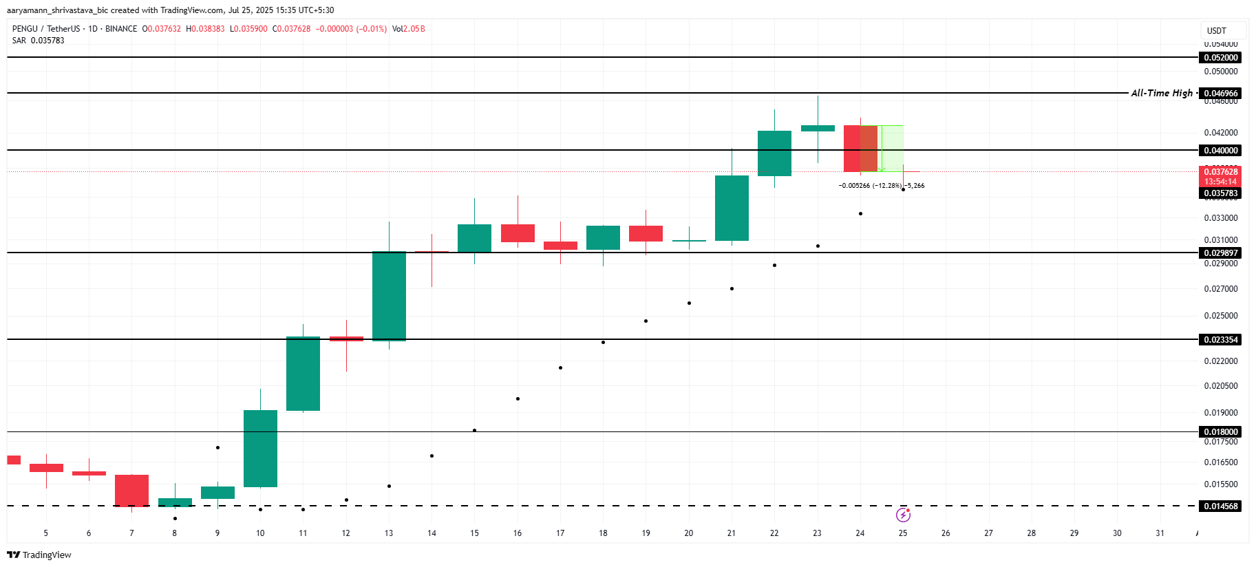 PENGU è scesa del 12% nelle ultime 24 ore, scambiata a $0,037. L’altcoin è scivolata sotto il livello di supporto di $0,040 dopo un tentativo fallito di superare il suo massimo storico (ATH) di $0,046. Questo calo riflette un momentum in diminuzione e un’incertezza tra gli investitori.