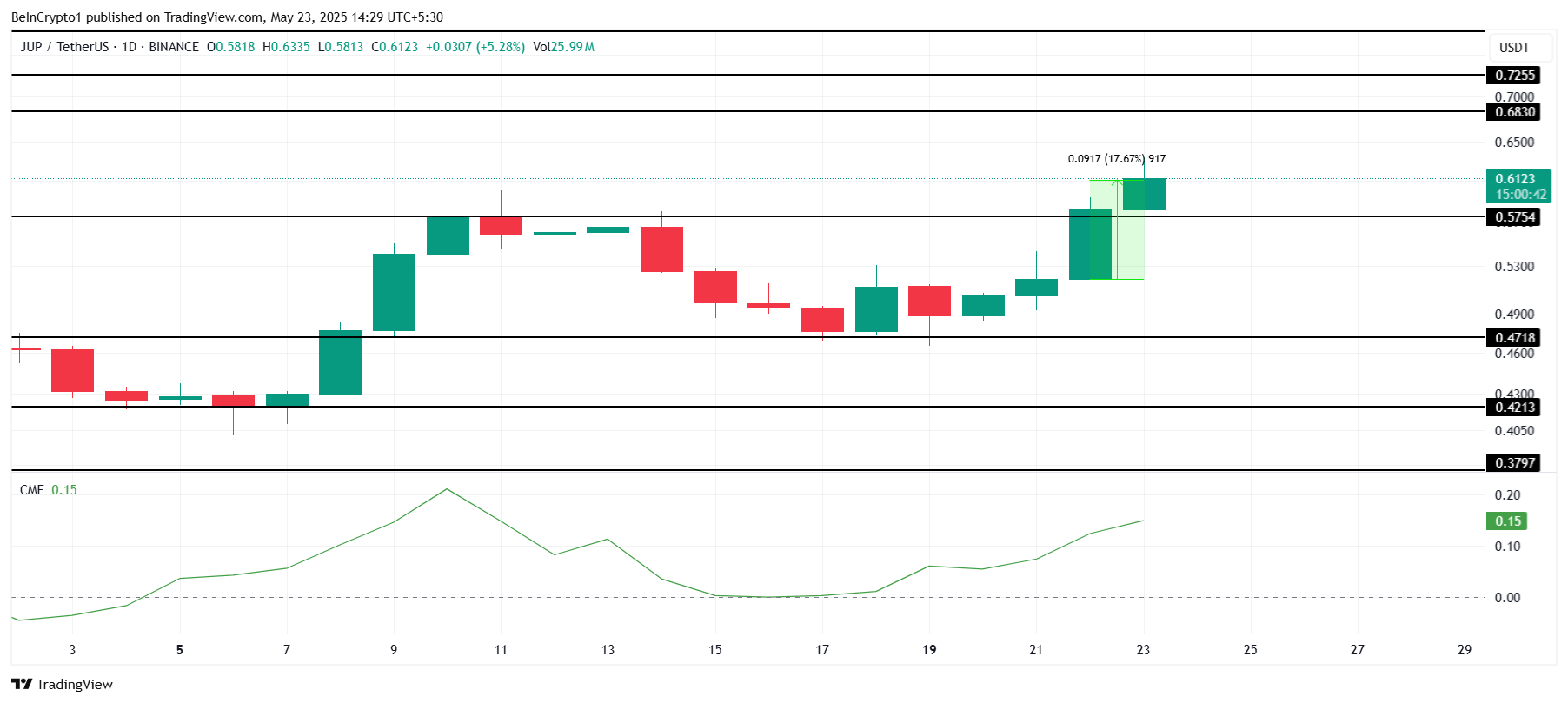 Come risultato di questo aumento degli afflussi, il prezzo di JUP è aumentato del 17,6% nelle ultime 24 ore, portando il prezzo a $0,61. Il token ora punta a garantire $0,57 come base di supporto. Un rimbalzo riuscito a questo livello potrebbe spingere l’altcoin verso $0,68, continuando il suo rally.
