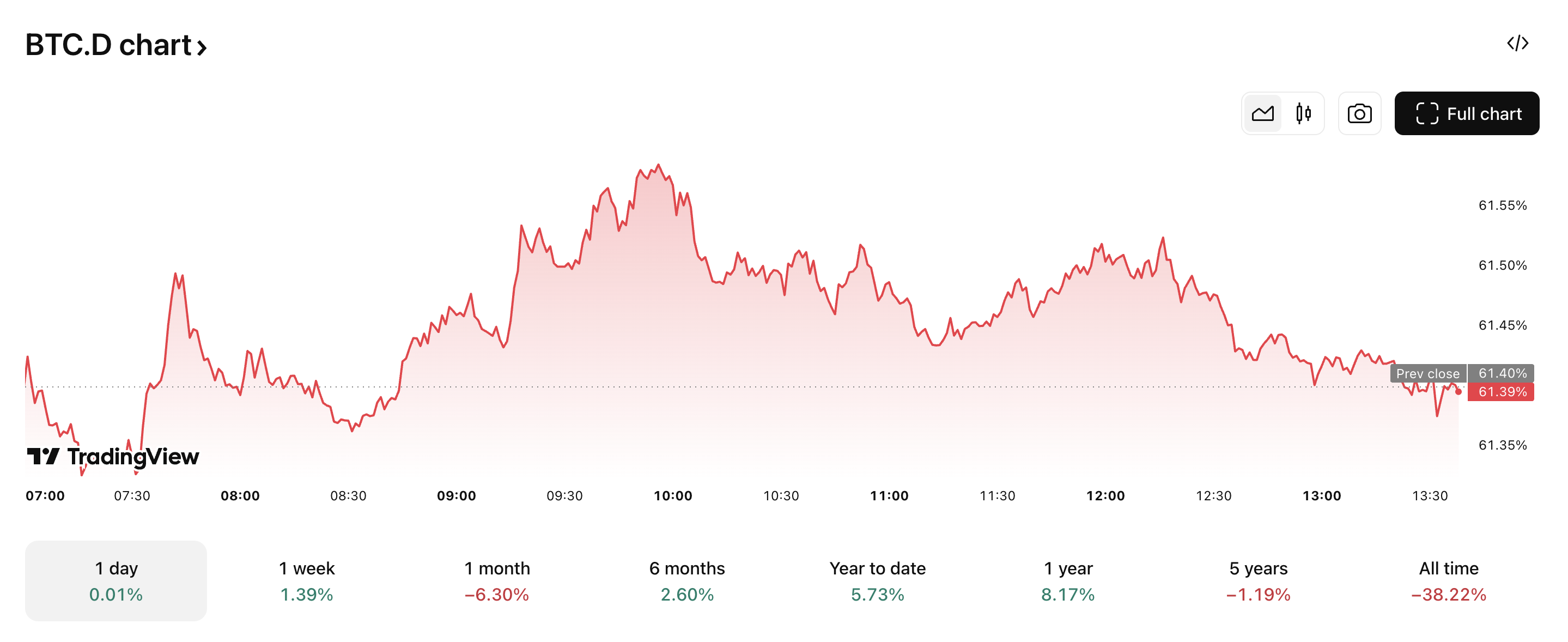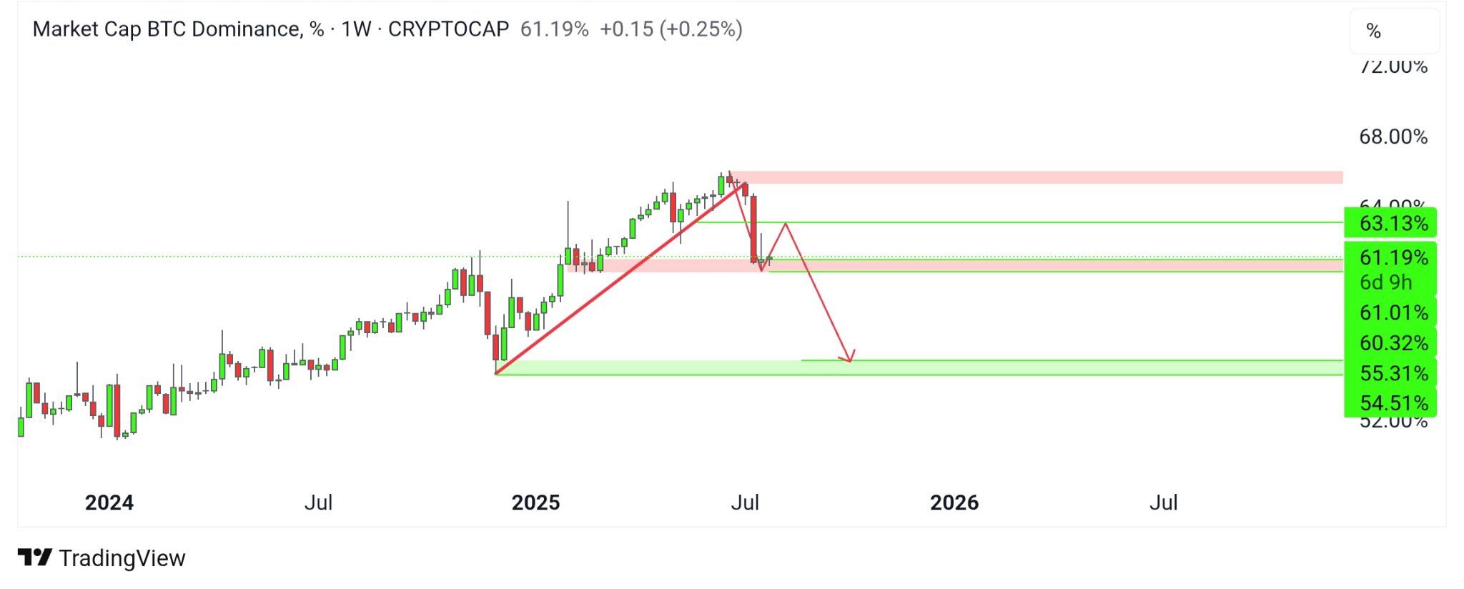 Nelle ultime settimane, il Bitcoin Dominance Index (BTC.D), che misura la quota di mercato di Bitcoin rispetto all’intero mercato delle criptovalute, ha registrato un forte calo del 6,30%.