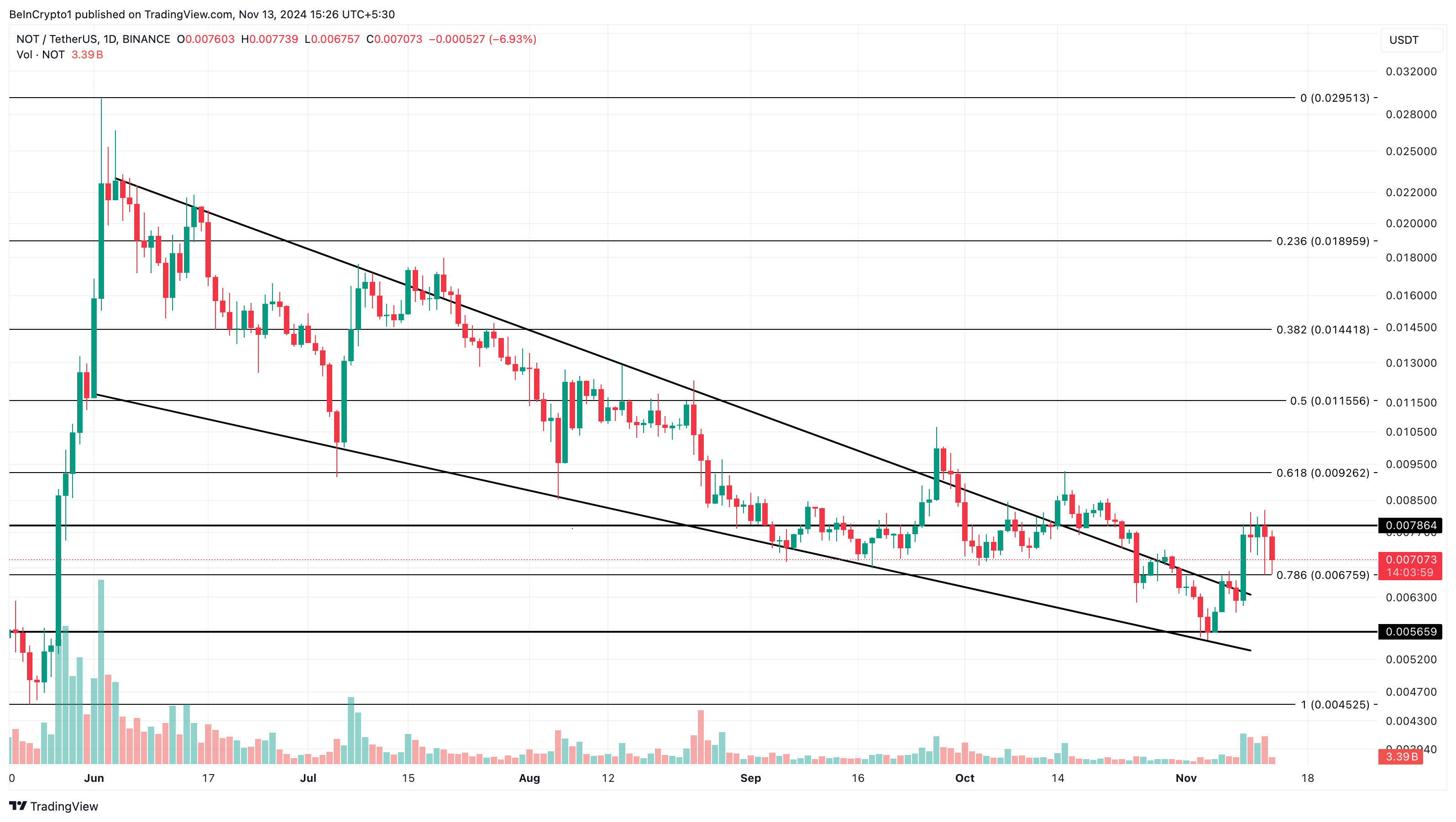 Nelle ultime 24 ore, il prezzo di NOT è diminuito del 12% e attualmente si scambia a 0,0070 USD. Sul grafico giornaliero, l’altcoin inizialmente è uscito da un cuneo discendente e mostrava segni di una possibile risalita verso 0,012 USD.