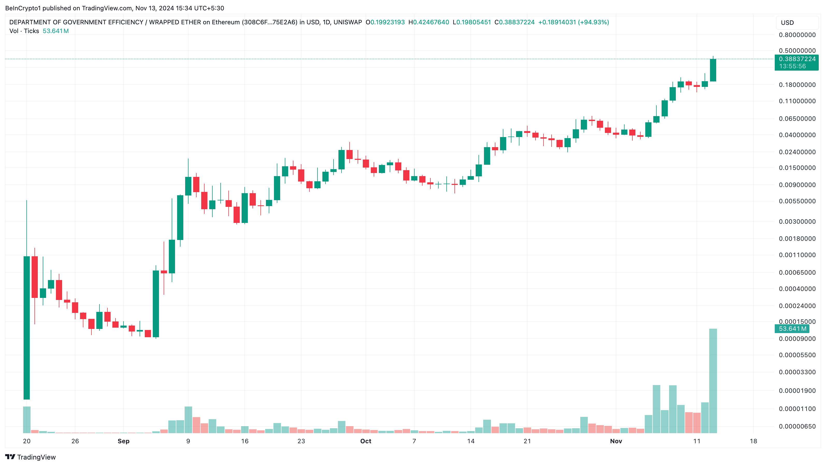 Ultima nella lista delle altcoin in tendenza oggi è il Department of Government Efficiency, un memecoin di Solana creato in risposta alla proposta di Elon Musk per il governo in arrivo guidato da Donald Trump.