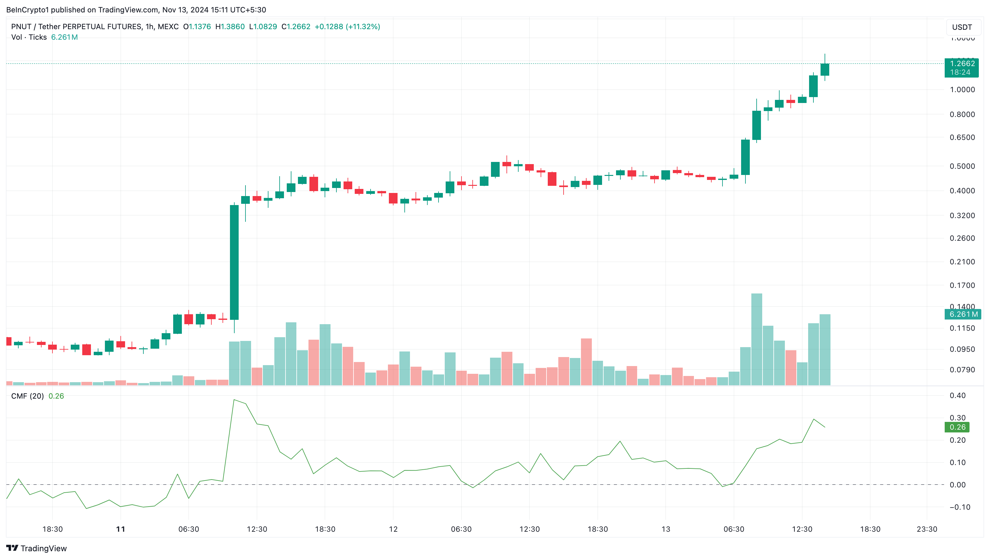 SponsoredSe questo trend continua, il prezzo di PNUT potrebbe continuare a salire, specialmente perché il Chaikin Money Flow (CMF) mostra una crescente pressione all’acquisto. In tal caso, il valore del token potrebbe salire a 2 USD. Tuttavia, un aumento delle vendite potrebbe cambiare le cose e PNUT potrebbe scendere sotto la soglia di 1 USD.