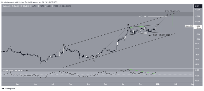 Sponsored SponsoredSe LINK esce dal canale, l’obiettivo più probabile per la parte superiore del movimento verso l’alto è 23,75 dollari, il 50% sopra il prezzo attuale. L’obiettivo si trova attribuendo all’onda cinque la stessa lunghezza dell’onda uno.