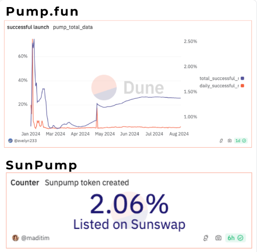 Nonostante l’entusiasmo iniziale per SunPump e Pump.fun, i tassi di conversione degli scambi decentralizzati (DEX) per entrambe le piattaforme sono rimasti piuttosto bassi, con SunPump al 2,1% e Pump.fun all’1,4%.