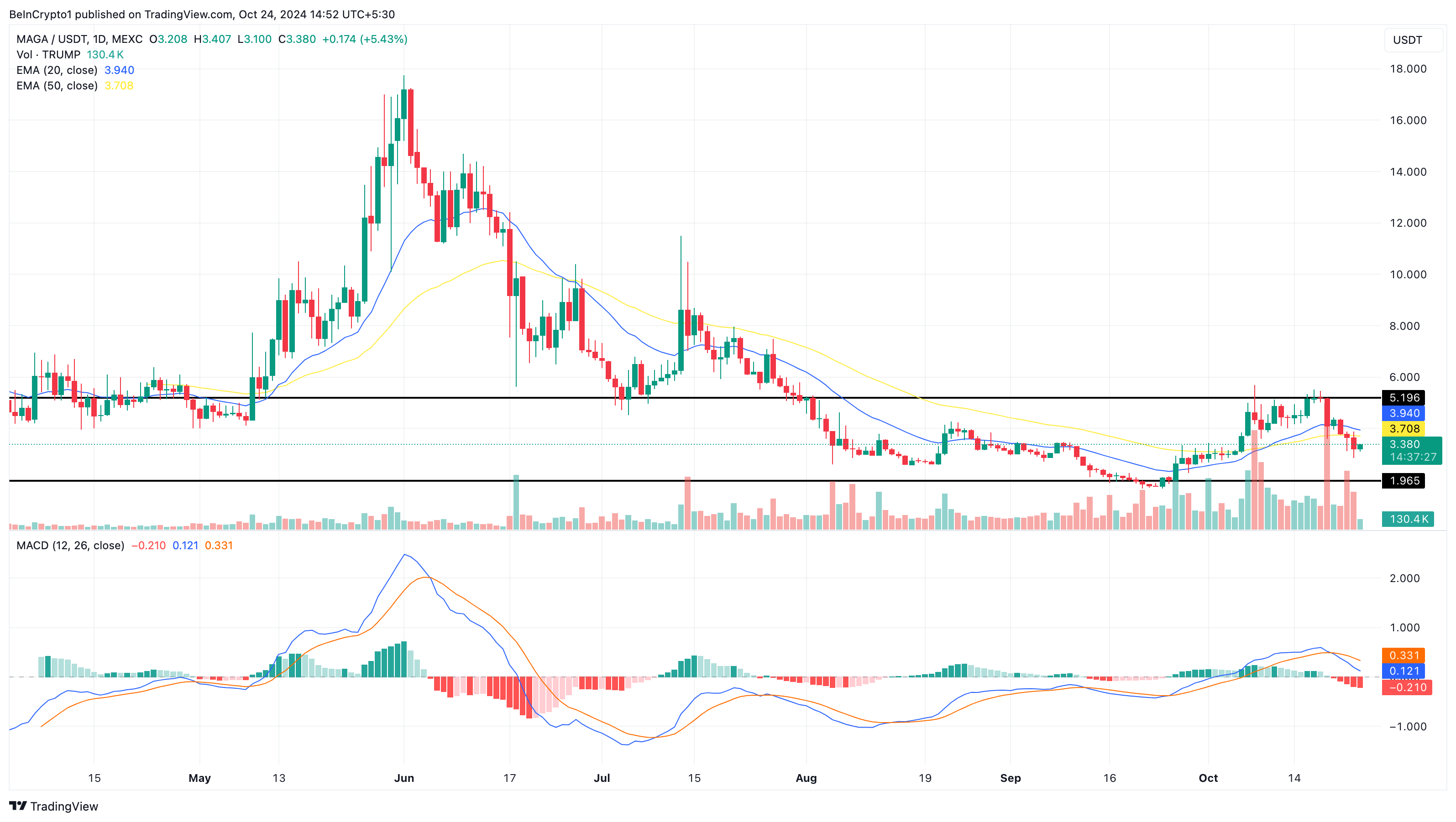 In contrasto con KAMA, MAGA, il memecoin a tema Trump con la più alta capitalizzazione di mercato, ha subito un calo di prezzo. Al momento della pubblicazione, il prezzo di TRUMP è di 3,30 USD, riflettendo un significativo calo del 35,60% negli ultimi sette giorni.