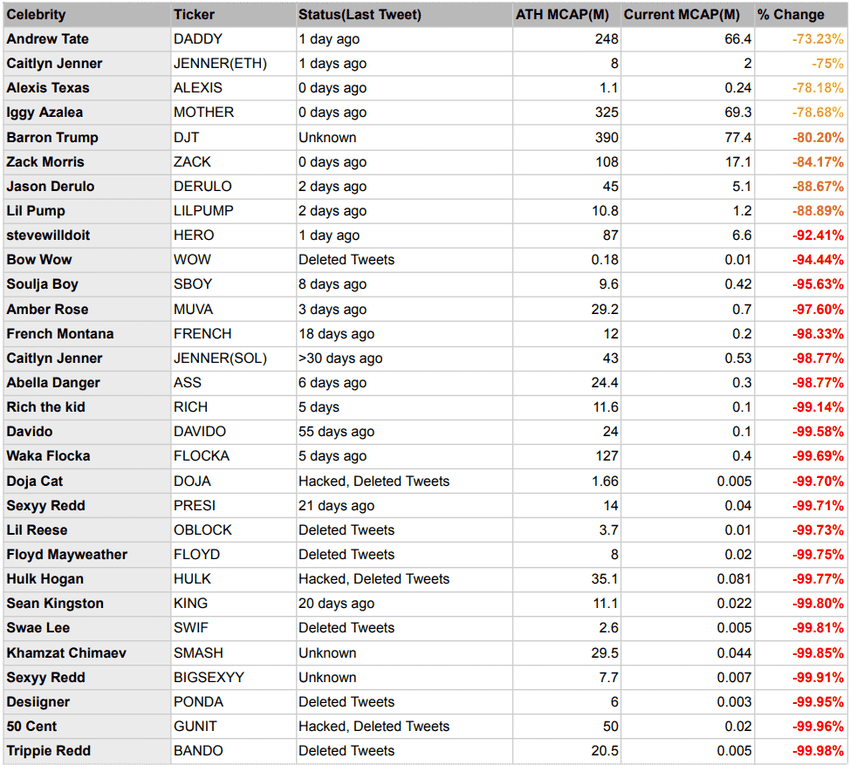 L’analista di criptovalute Slorg ha svelato una serie di dati preoccupanti sul destino delle monete memecoin delle celebrità. Oltre 30 celebrità, includendo Andrew Tate e Iggy Azalea, hanno lanciato i loro token sulla blockchain Solana il mese scorso.