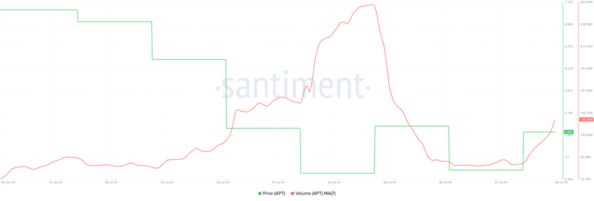 Nonostante il declino del prezzo di APT, il suo volume di scambiare giornaliero ha subito un’impennata. Mentre il prezzo del token è sceso del 18% nell’ultima settimana, il suo volume di scambi è aumentato del 29% nello stesso periodo.