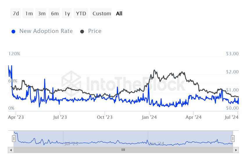 Inoltre, l’elevato tasso di adozione indica che Arbitrum non ha perso trazione sul mercato. Indipendentemente dalle fluttuazioni del panorama delle criptovalute, Arbitrum è riuscito a mantenere il suo appeal tra gli utenti. Questo potrebbe aiutare il prezzo a risalire.