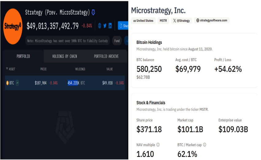 Mentre Arkham etichetta 454.231 BTC e ulteriori 70.816 BTC appartenenti a MicroStrategy, Bitcoin Treasuries mostra 580.250 BTC.