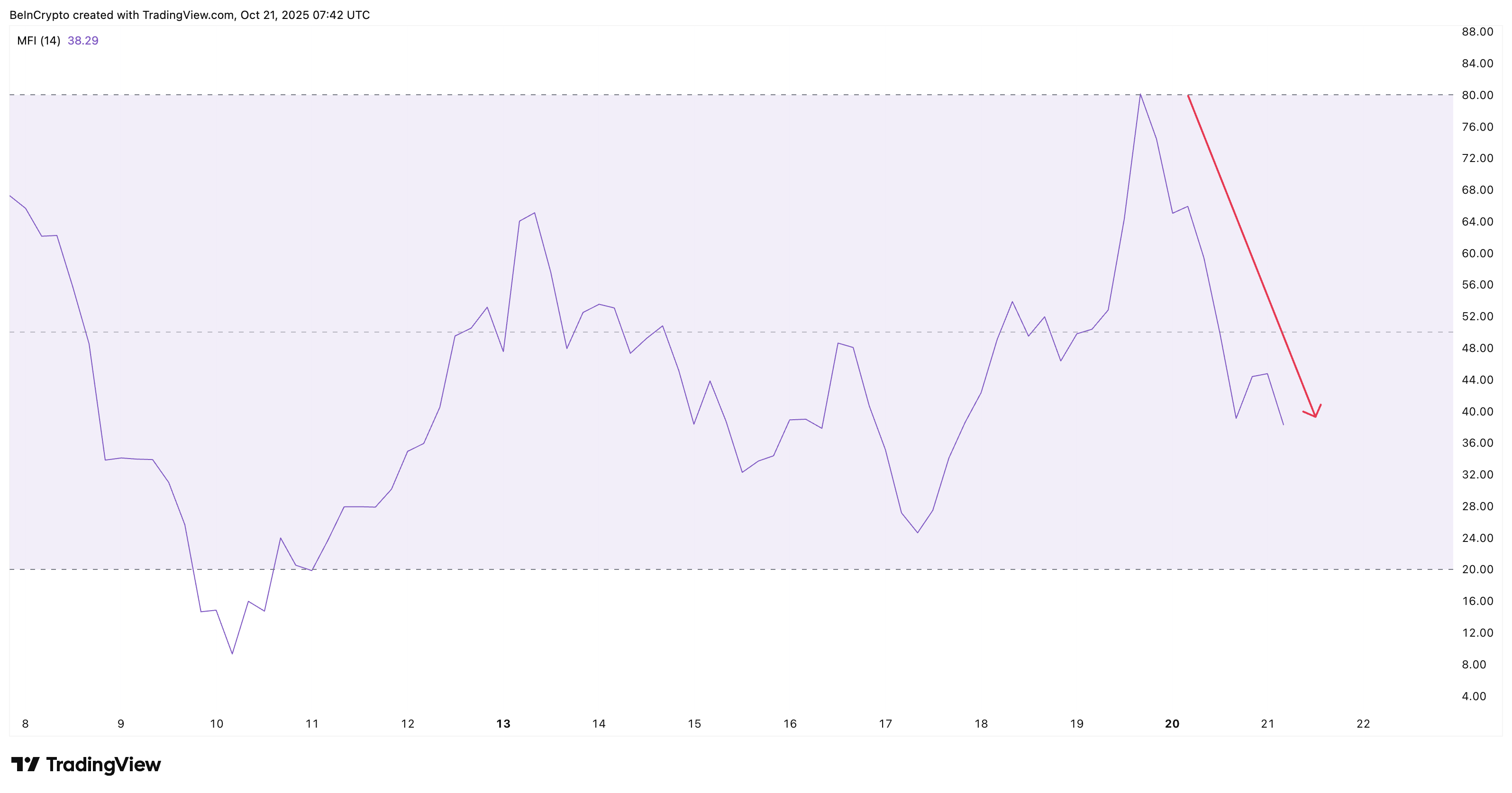 I piccoli investitori sembrano fare un passo indietro. Il Money Flow Index, che traccia quanto denaro sta entrando o uscendo dal mercato, è sceso di oltre il 50% dalla metà di ottobre, passando da quasi 80 a 38,27. Ciò significa che i trader retail non stanno più acquistando in modo aggressivo. Di solito segnala debolezza, ma può anche creare condizioni in cui i grandi trader accumulano silenziosamente prima di un movimento al rialzo.