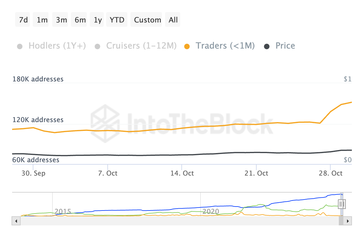 Oltre all’attività delle whale di Dogecoin, il comportamento dei detentori a breve termine (STH) è stato fondamentale nel sostenere il recente rally di DOGE. Secondo i dati di IntoTheBlock, gli STH di Dogecoin—coloro che detengono le loro monete per meno di 30 giorni — hanno aumentato il loro periodo medio di detenzione del 39% nell’ultimo mese.