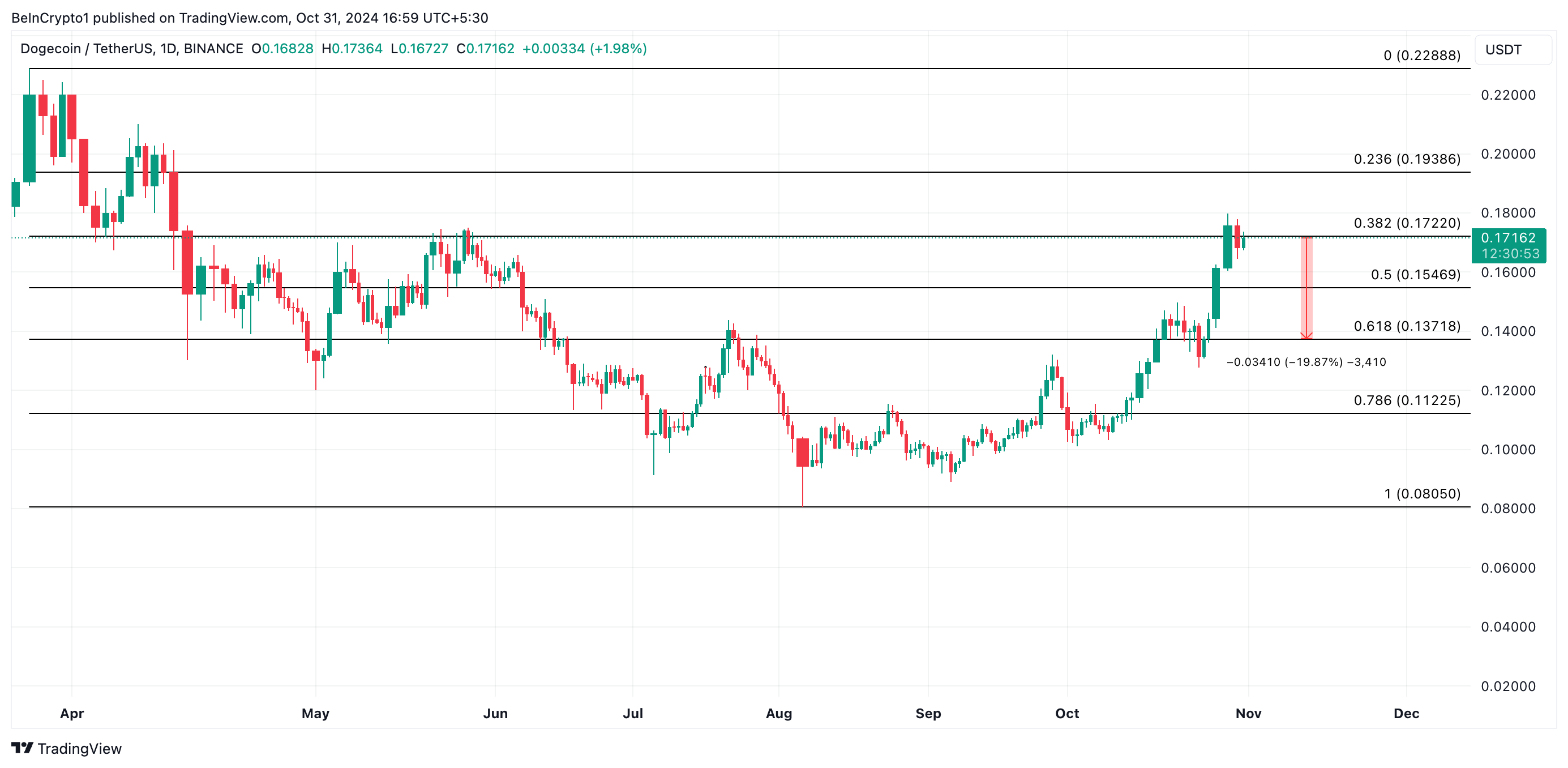 Il memecoin leader Dogecoin (DOGE) ha seguito una traiettoria ascendente nelle ultime settimane. Con un guadagno del 45% negli ultimi 30 giorni, è attualmente scambiato a 0,17 USD, il suo livello più alto da maggio.