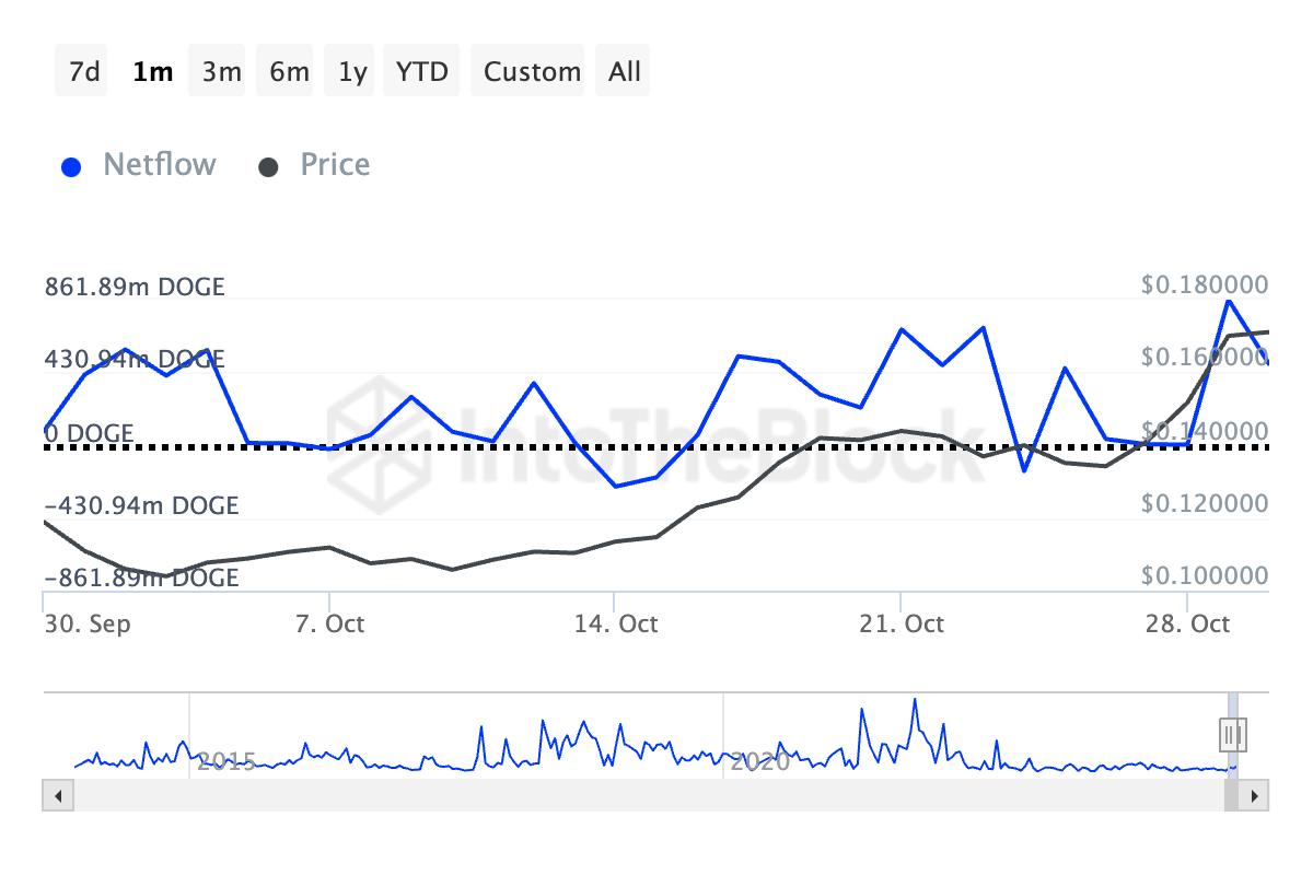 L’attività delle whale di Dogecoin è aumentata nell’ultimo mese, come riflettono i dati di IntoTheBlock. Questi mostrano un aumento del 15% negli ultimi 30 giorni.