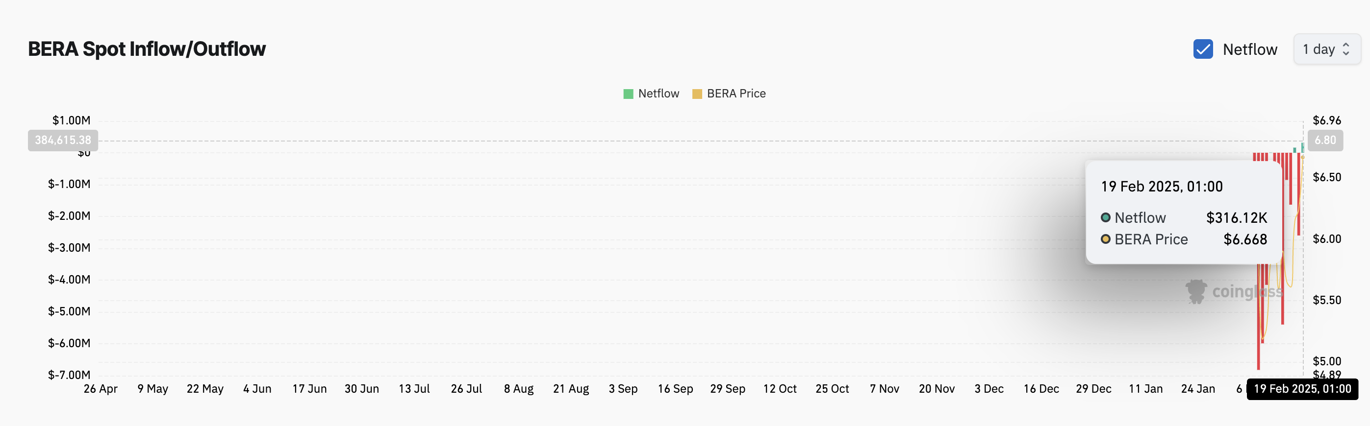 Quando un asset registra afflussi spot, c’è un aumento significativo dell’attività di acquisto diretto sugli exchange spot, indicando una forte domanda da parte degli investitori che desiderano detenere l’asset. Questo segnala un momentum rialzista nel mercato BERA, poiché la reale pressione d’acquisto farà salire i suoi prezzi.