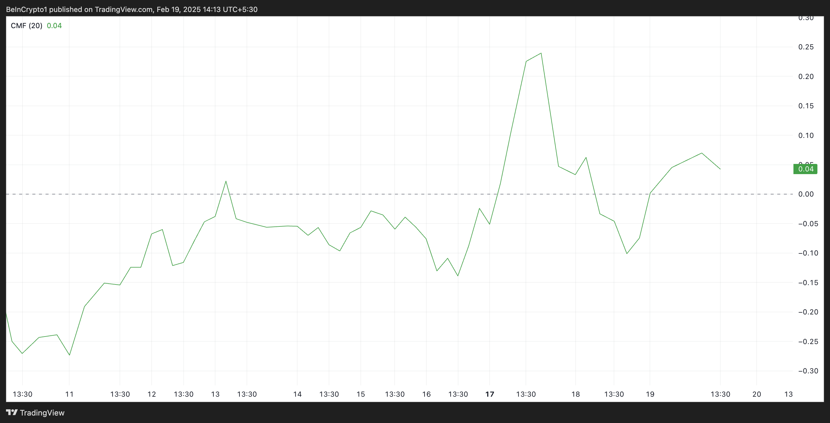 L’aumento a doppia cifra di BERA è supportato da una forte pressione d’acquisto, come riflesso nel suo Chaikin Money Flow (CMF) positivo. Al momento della scrittura, l’indicatore CMF, che misura i flussi in un asset, è sopra la linea dello zero a 0,04.