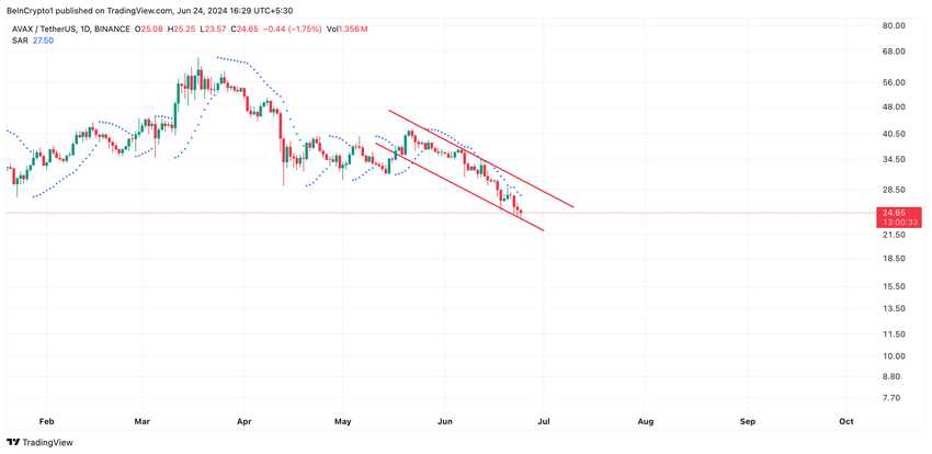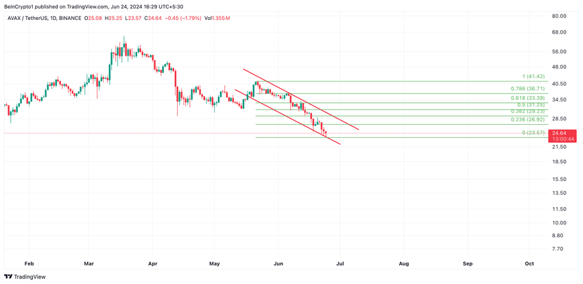 Al momento della stampa, AVAX scambia a 24,82 dollari, vicino al livello di supporto. Se questo livello viene superato, la tendenza ribassista continuerà e il prezzo del token scenderà ulteriormente.