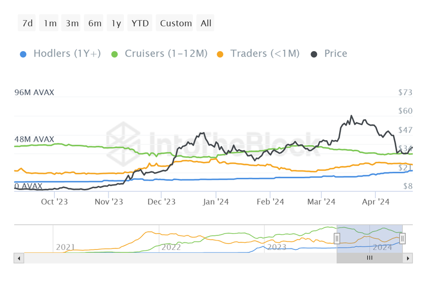 Nelle ultime tre settimane, i possessori di AVAX hanno accumulato oltre il 4% dell’offerta circolante per oltre un anno, con un conseguente aumento di 4,2 milioni di AVAX per un valore di 161 milioni di dollari nei loro portafogli, portando il totale a 20,72 milioni di AVAX.
