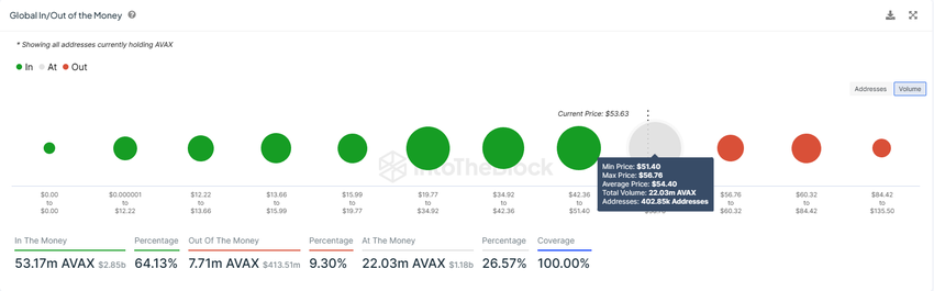 La metrica Global In/Out of Money (GIOM) evidenzia l’offerta acquistata a determinati livelli di prezzo e la sua posizione attuale. Quasi 22 milioni di AVAX acquistati tra 51 e 56 dollari cadranno nelle grinfie dei ribassisti se il prezzo di Avalanche dovesse scendere sotto i 51 dollari.