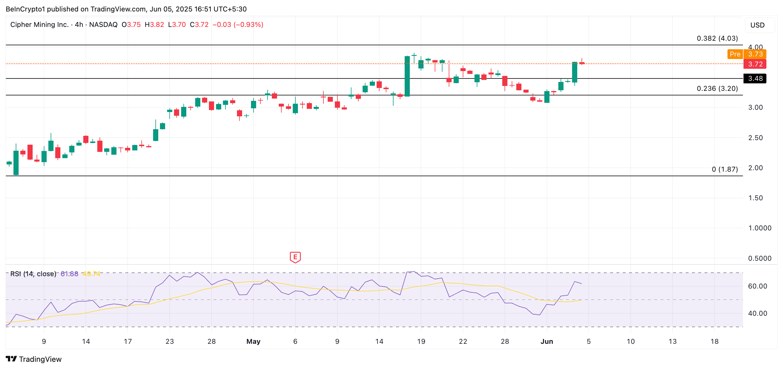 CIFR è scambiato a $3,73 al momento della pubblicazione, in aumento del 9% oggi. L’indice di forza relativa (RSI) in aumento del titolo conferma che la domanda di mercato sostiene il rally del prezzo. Questo indicatore di momentum attualmente si attesta a 61,88 ed è in crescita.