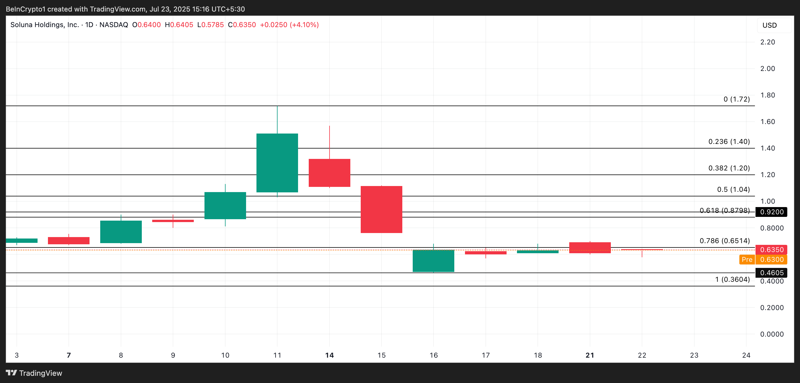 Sponsored SponsoredNel trading pre-market, SLNH è leggermente inferiore a $0,63. Se la pressione d’acquisto aumentasse all’apertura del mercato, SLNH potrebbe salire verso $0,65.
