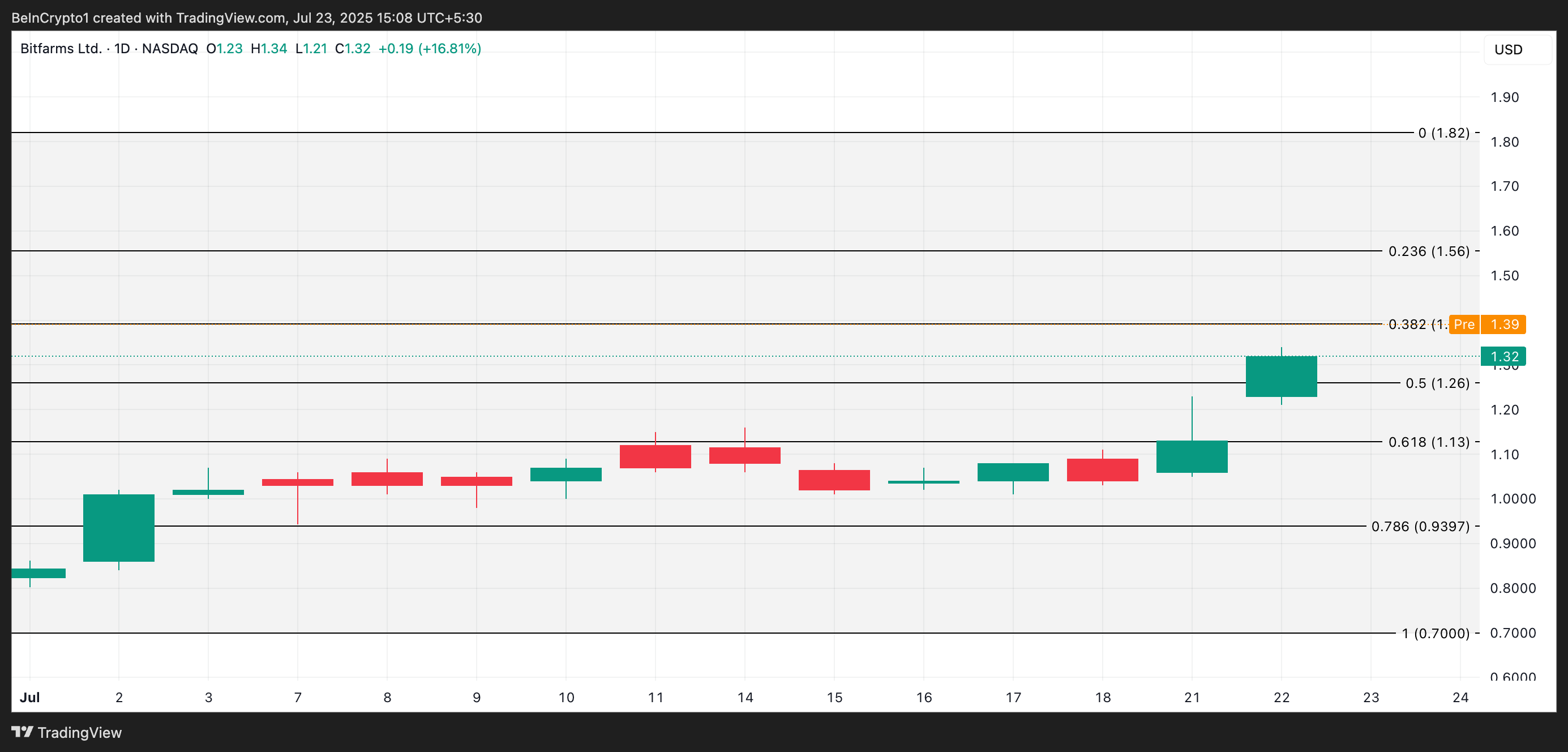 L’annuncio ha suscitato un forte interesse da parte degli investitori. Nella sessione pre-market, BITF viene scambiato a $1,43. Se la domanda continuasse a crescere dopo l’apertura del mercato, il titolo potrebbe salire verso il livello di $1,56.