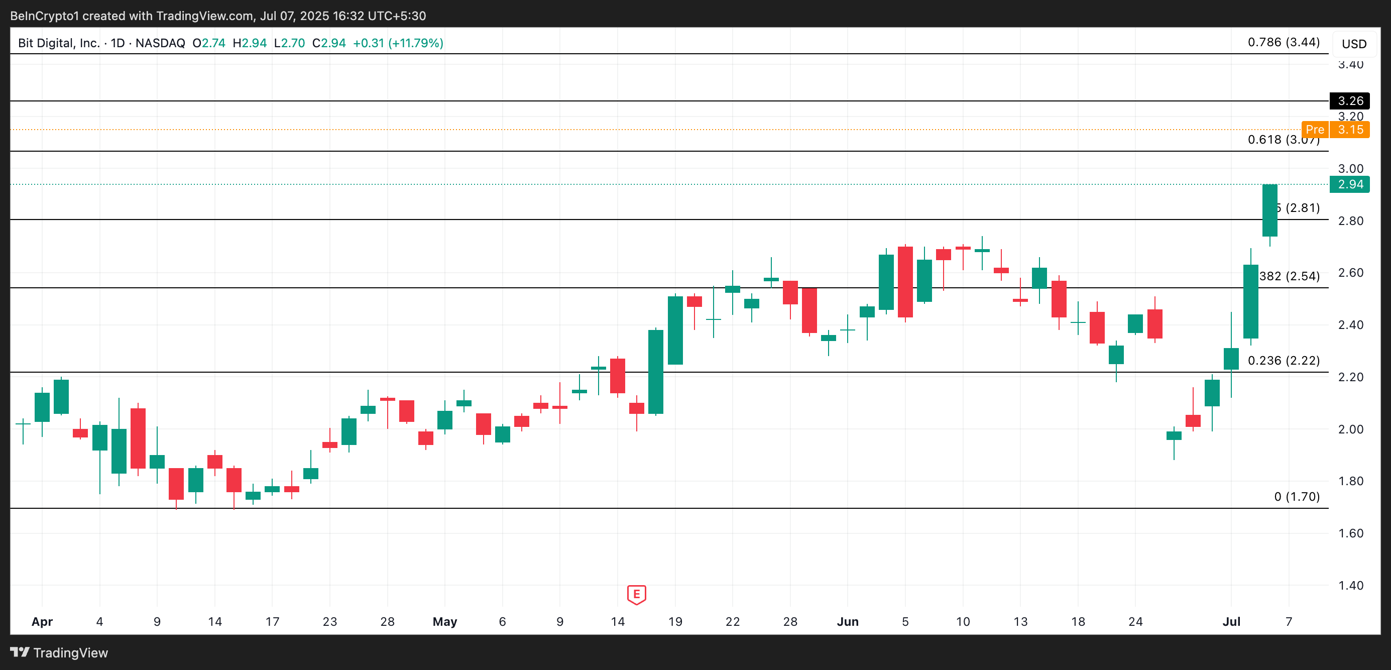 BTBT è scambiato a $3,15 durante la sessione pre-market di oggi. Se l’attività di acquisto aumentasse una volta aperto il trading regolare, il titolo potrebbe spingersi verso $3,26.