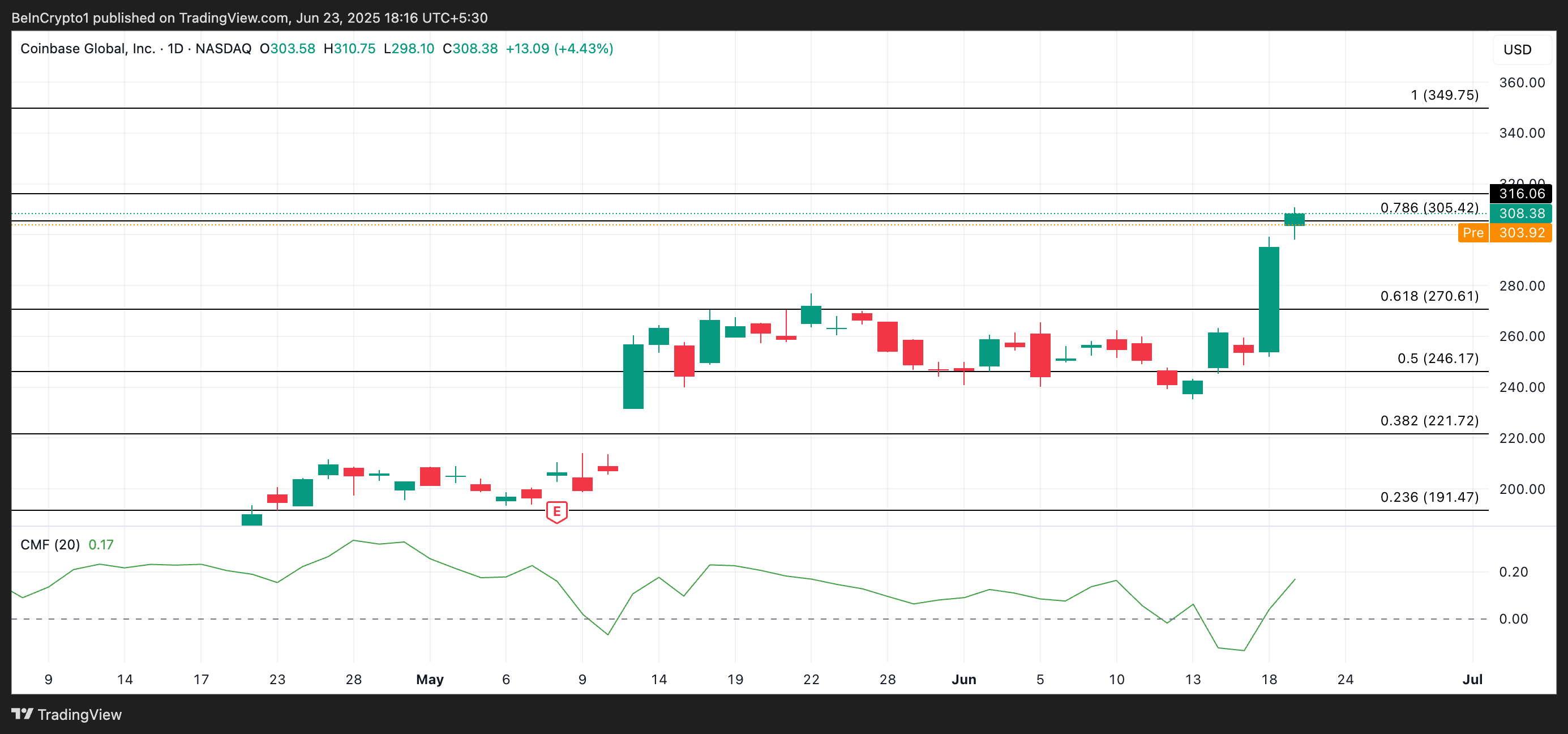 Questo sviluppo ha rafforzato il prezzo di COIN, in aumento del 4% nel trading pre-mercato. Al momento della scrittura, il suo Chaikin Money Flow (CMF) è a 0,17 e in trend rialzista, evidenziando la domanda per COIN.