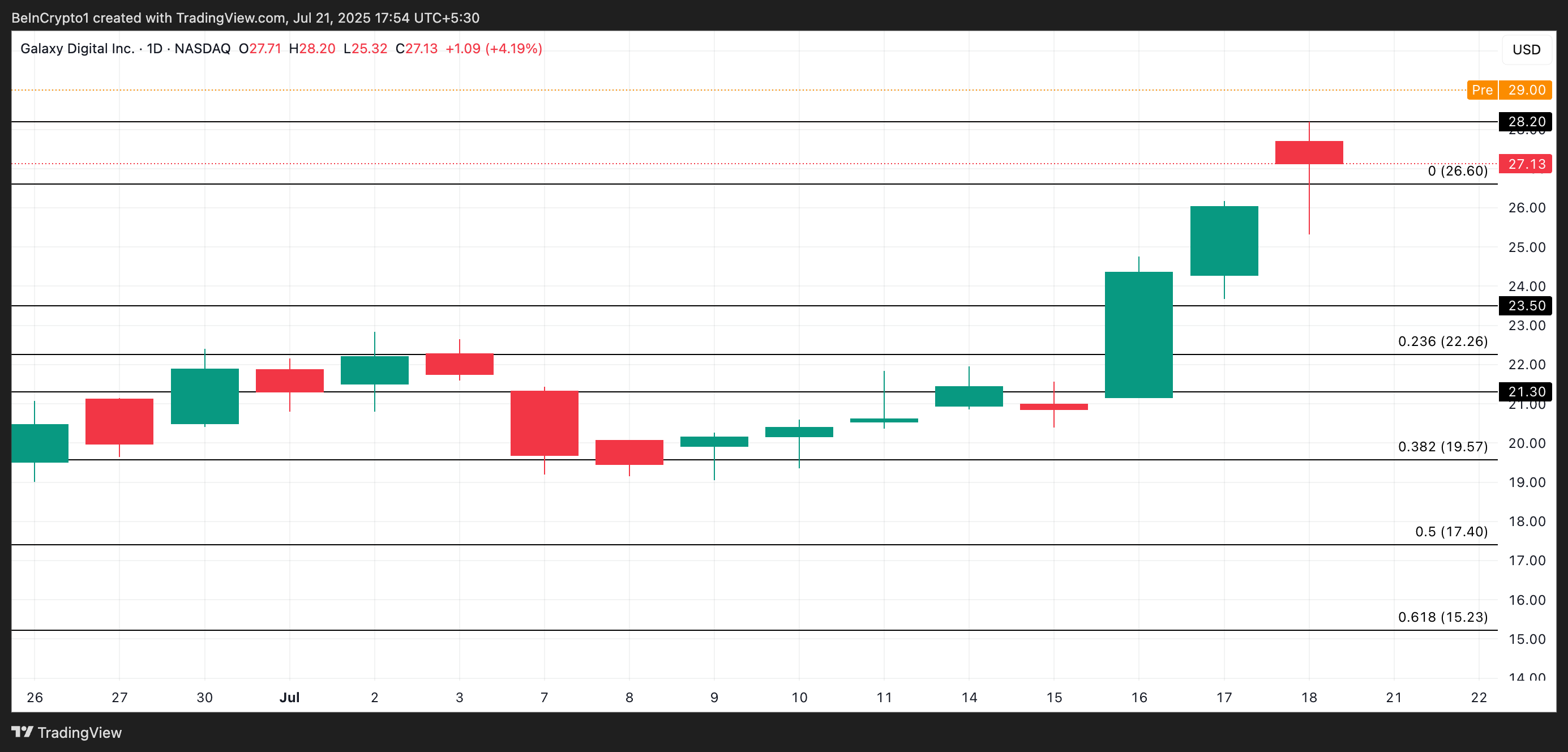 Nel pre-market di oggi, GLXY è scambiato a $29. Un aumento della domanda degli investitori dopo l’apertura delle contrattazioni potrebbe portare il titolo verso $30.