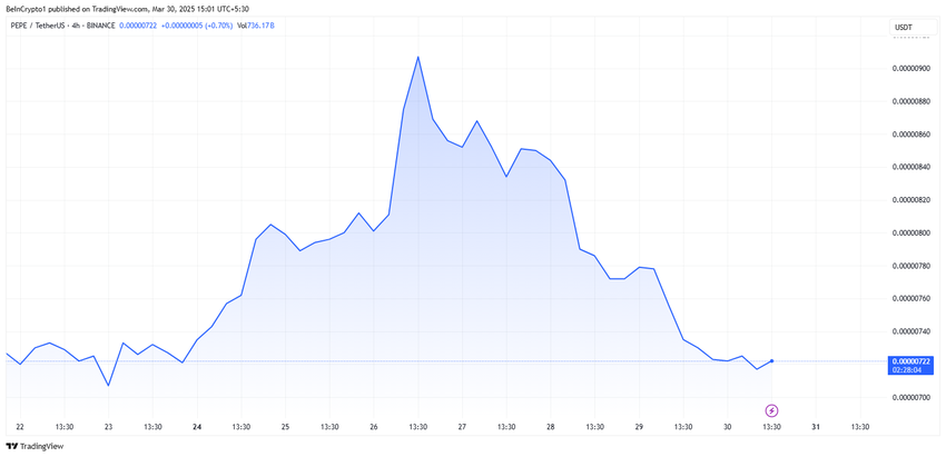 Il prezzo di PEPE è sceso di oltre 5% nelle ultime 24 ore e veniva scambiato a $0,00000721 al momento della pubblicazione.
