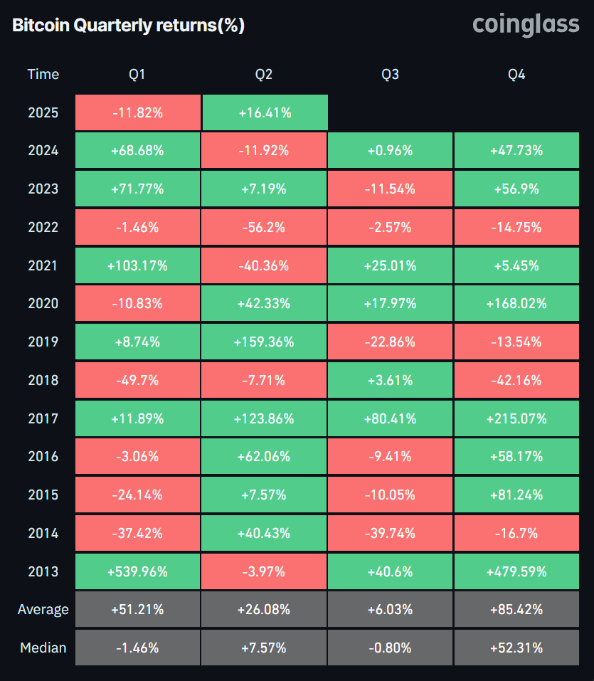 I trend stagionali spesso raffreddano i rally estivi. Storicamente, Bitcoin ha guadagnato in media il 26% nel Q2, ma la mediana è stata solo del 7,6% dal 2013. Si sono anche verificati cali bruschi, come avvenne con il crollo del 56,2% nel Q2 2022.