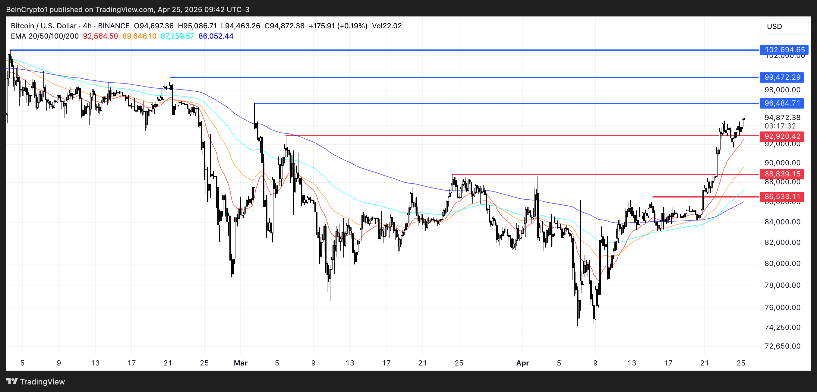 Il prezzo di Bitcoin potrebbe sfidare livelli di resistenza chiave a $96.484 e $99.472 se questo slancio continua. Un superamento di questi livelli potrebbe aprire la strada a un superamento della soglia psicologica dei $100.000, con il prossimo obiettivo principale vicino a $102.694—il livello più alto da inizio febbraio.