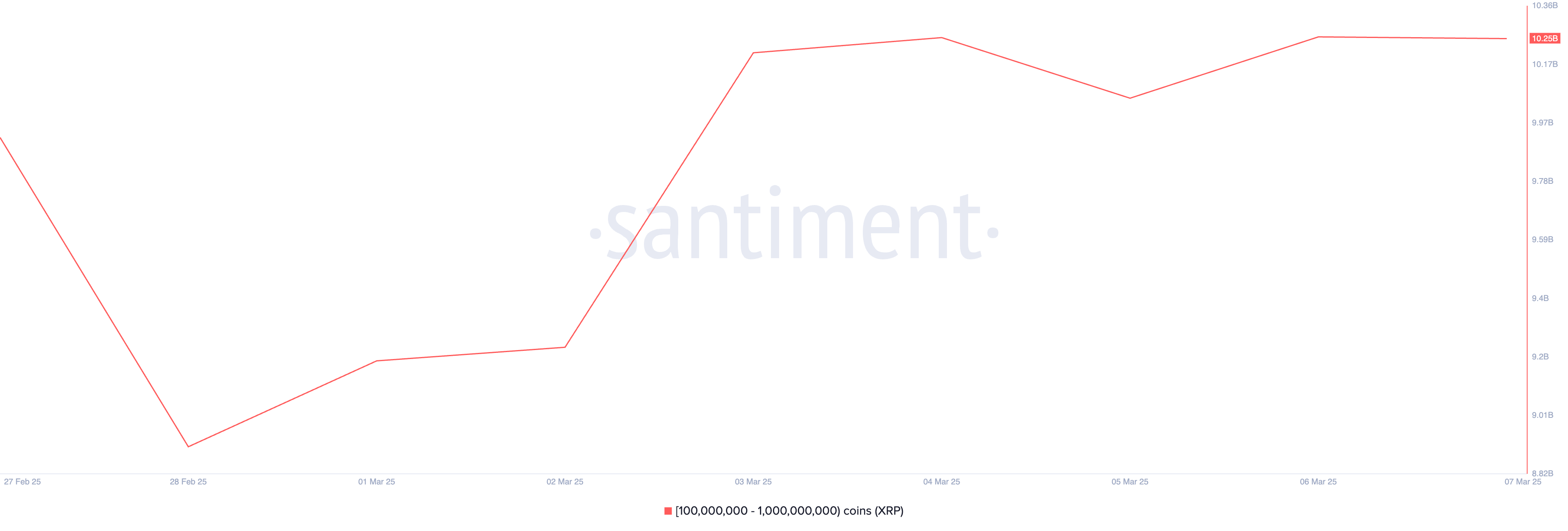 Durante la settimana in esame, le balene hanno anche aumentato le loro partecipazioni in XRP. I dati di Santiment hanno mostrato un aumento della quantità di token nei wallet delle grandi balene che possiedono tra 100 milioni e 1 miliardo di XRP.