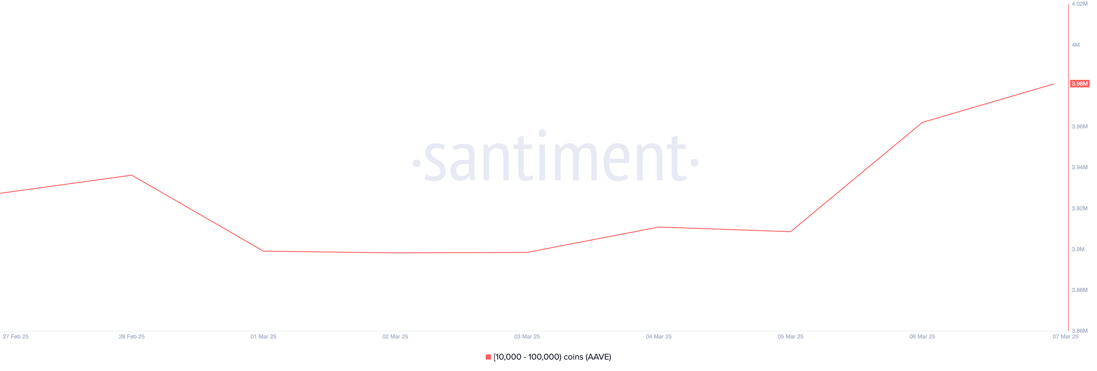 Secondo Santiment, questo gruppo di investitori ha acquisito 50.000 token AAVE negli ultimi sette giorni, portando il totale delle loro partecipazioni a un massimo storico di 3,98 milioni di token.