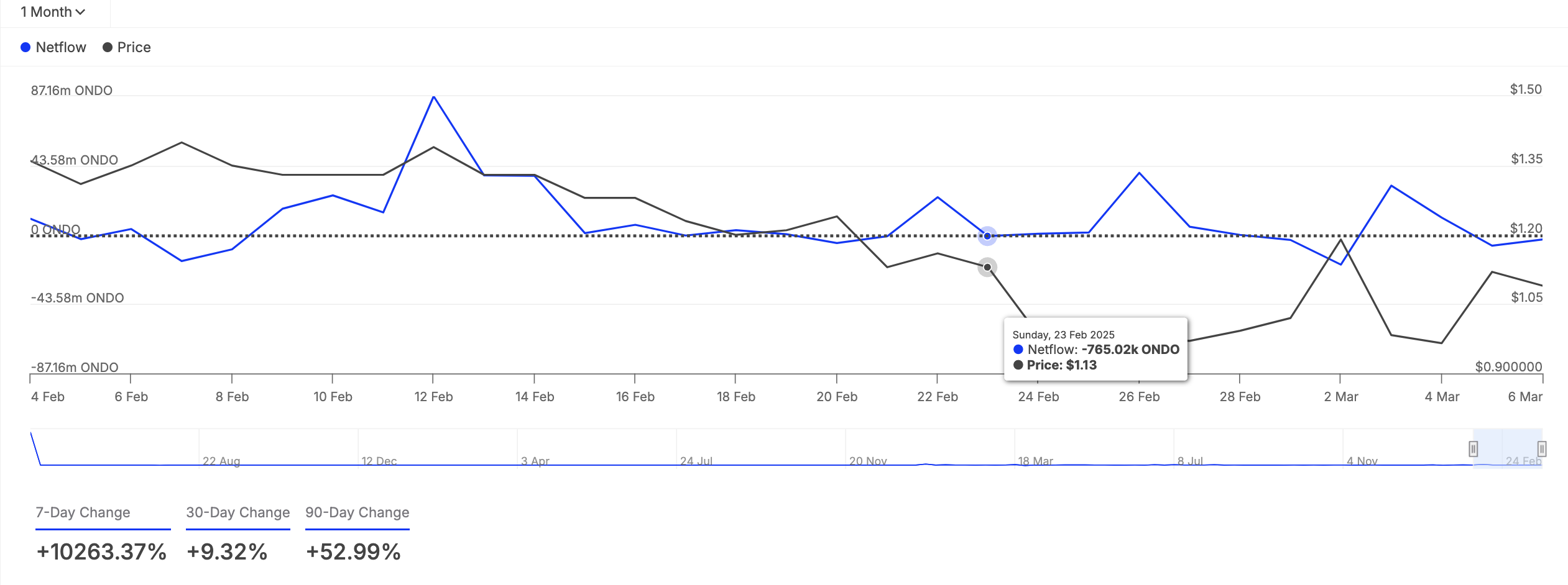Quando aumenta, significa che gli indirizzi delle balene stanno accumulando più token, un trend che segnala un sentimento rialzista. Questo può innescare FOMO tra i trader retail di ONDO, aumentando la domanda e aumentando la pressione sul suo prezzo.