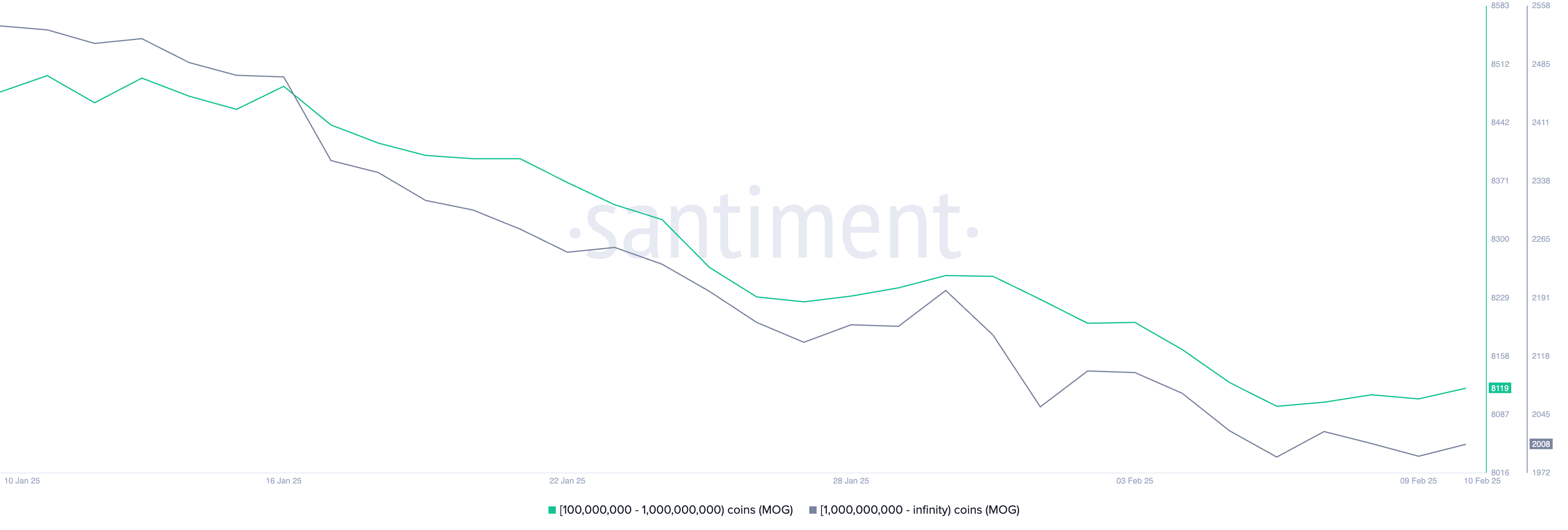 Le balene hanno venduto la memecoin MOG costantemente per diversi mesi, con questa pressione di vendita che si è accelerata all’inizio di febbraio. La riduzione delle posizioni da parte dei grandi detentori può segnalare un cambiamento di sentimento, poiché l’attività delle balene spesso influenza l’azione del prezzo e la liquidità.