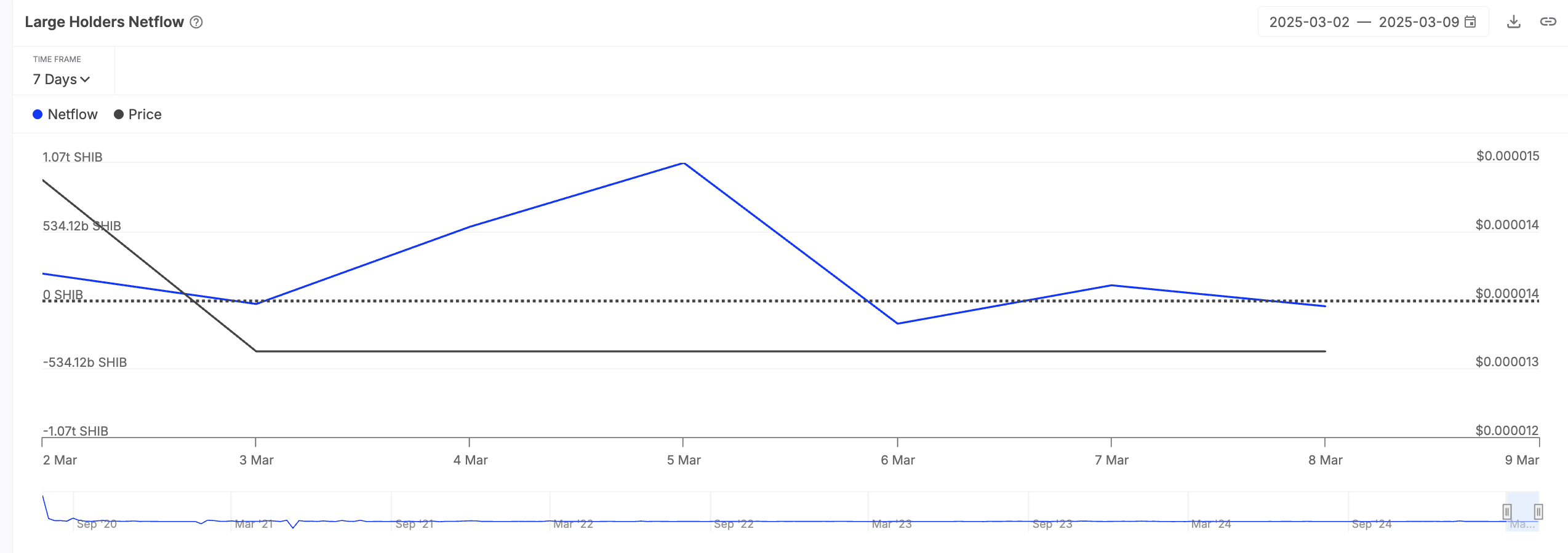 Secondo IntoTheBlock, il netflow dei grandi detentori di SHIB è diminuito del 123% nell’ultima settimana. Questo avviene in concomitanza con l’8% di calo del prezzo della memecoin.