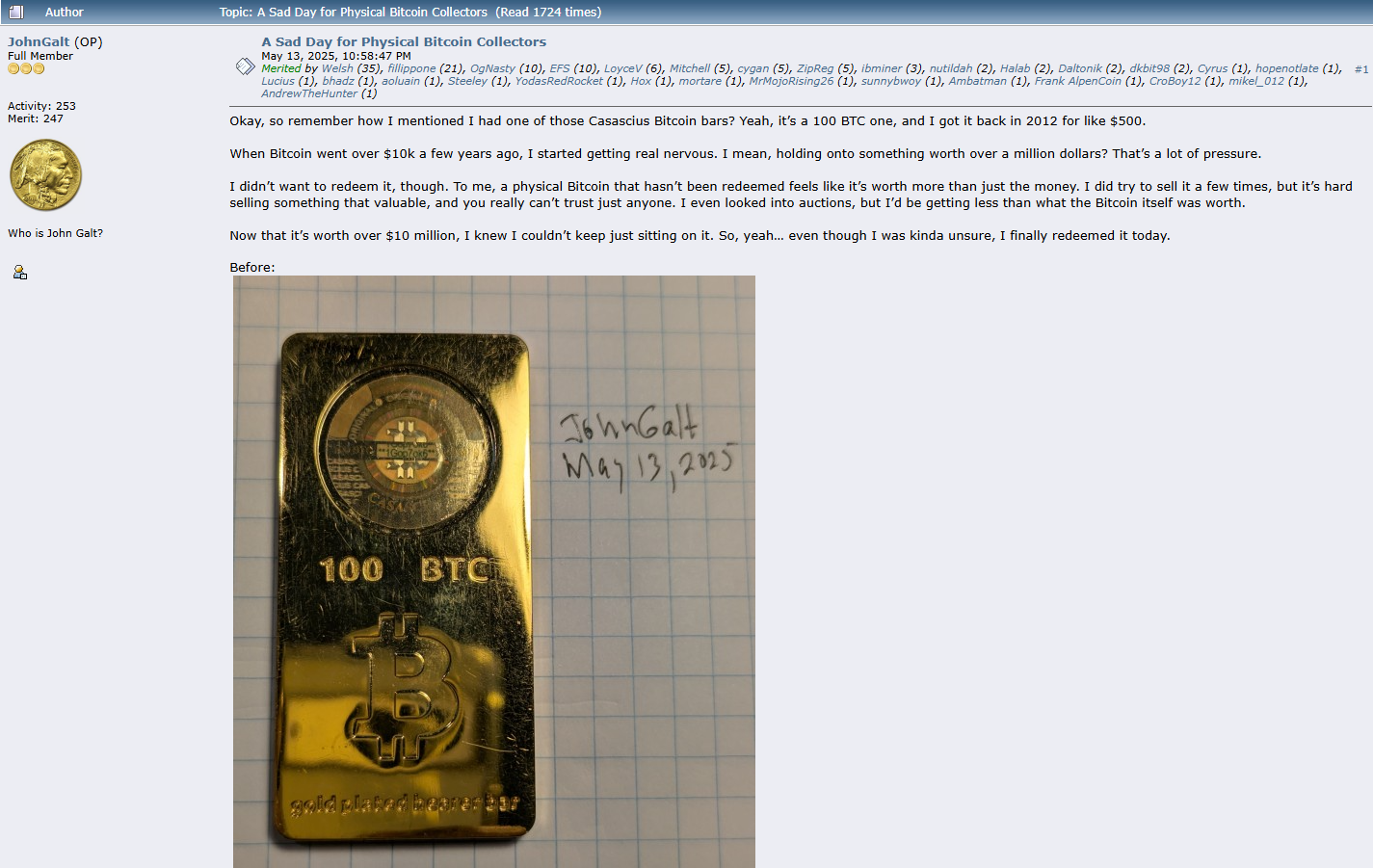Conosciuto come “JohnGalt” su Bitcointalk, l’early adopter ha rivelato di aver detenuto una barra di Casascius da 100 BTC per oltre 13 anni. L’ha acquistata per soli $500 quando Bitcoin era scambiato a $5.