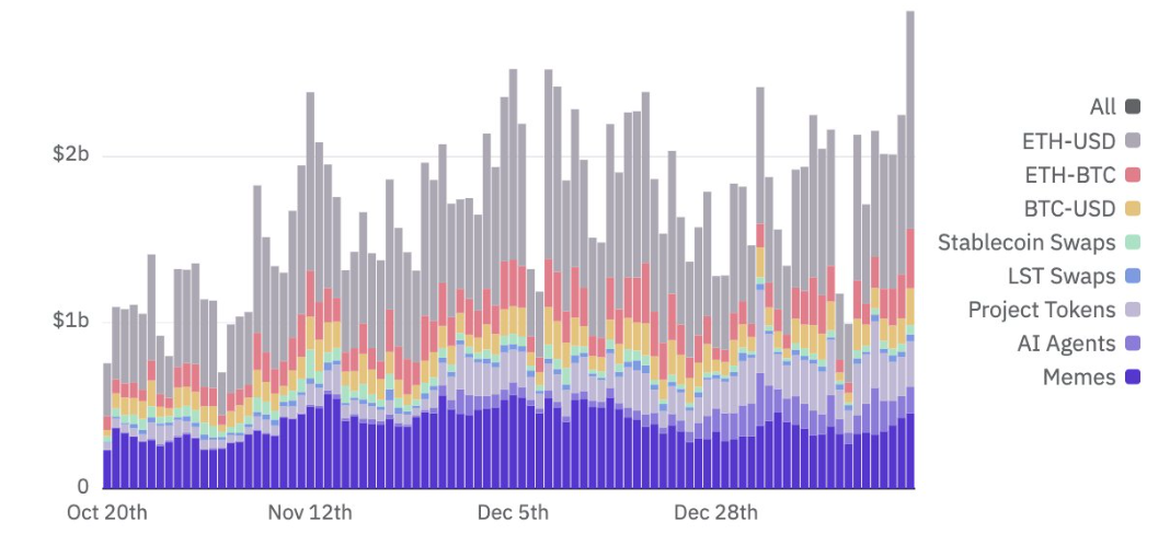 L’analista blockchain Dan Smith ha evidenziato il volume record di Base L2 di 2.9 miliardi USD, inclusi 1.3 miliardi USD in scambi ETH-USD, che ha anche raggiunto un massimo storico. Altre coppie di scambio, come ETH-cbBTC e BTC-USD, erano vicine a battere i propri record.