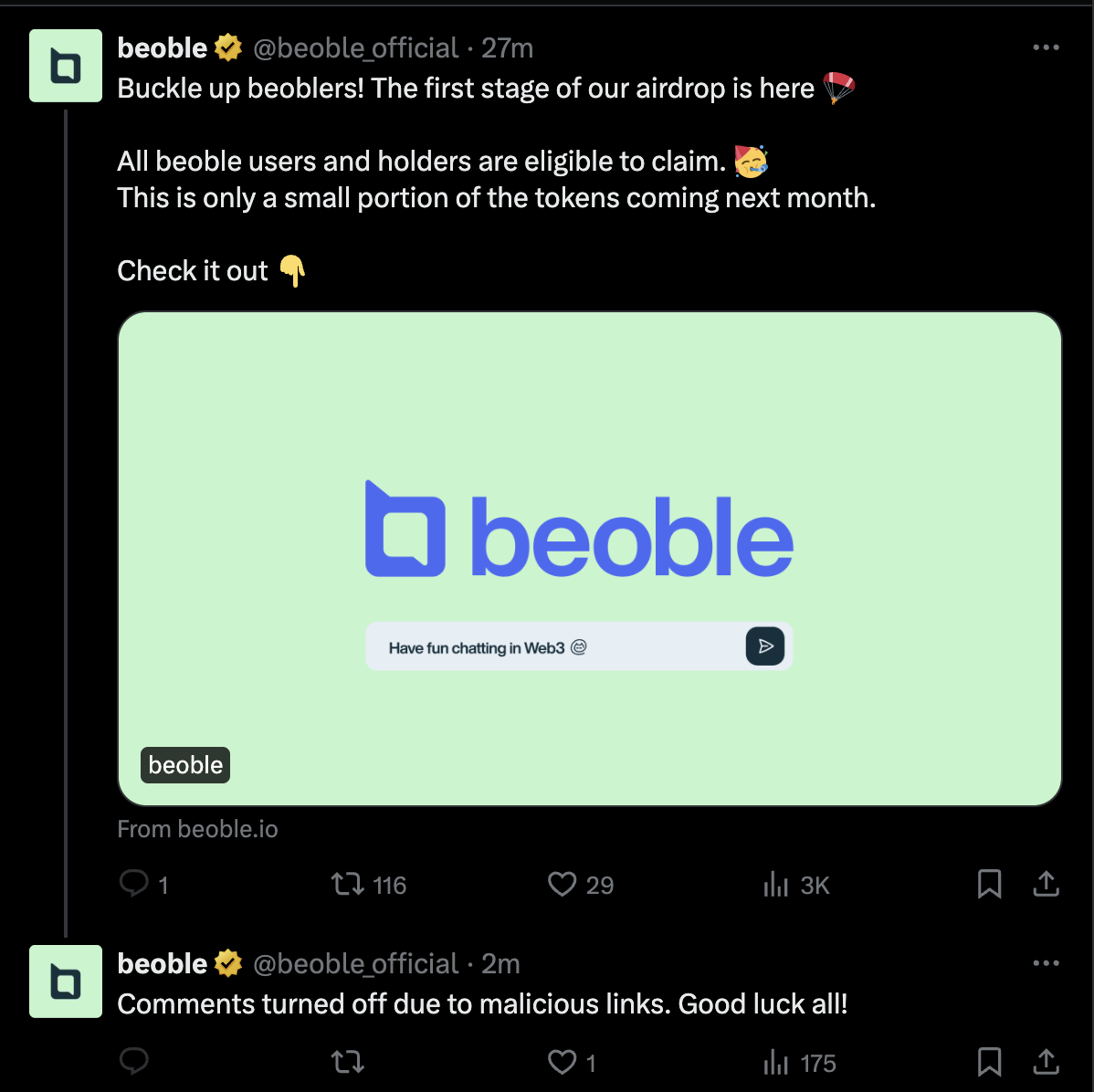 La società di sicurezza blockchain PeckShield ha annunciato la compromissione dell’account X di Beoble. In particolare, questo account è stato scoperto mentre diffondeva un link di phishing. Il link chiede in modo ingannevole agli utenti di verificare la loro idoneità a ricevere un airdrop.