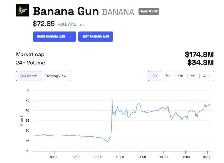 Questa impennata dei prezzi ha attirato l’attenzione di numerosi trader di criptovalute. Secondo Lookonchain, un trader ha recentemente investito 440 Ethereum (per un valore di circa 1,5 milioni di dollari) per acquistare 21.183 BANANA a un prezzo medio di 71,14 dollari, cogliendo lo slancio del prezzo.
