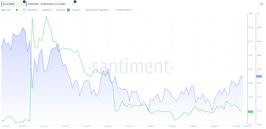 Tra il 3 e il 10 ottobre, investitori balenieri con saldi compresi tra 100.000 e 1 milione di XRP hanno aumentato le loro disponibilità da 3,77 miliardi a 3,82 miliardi di monete XRP. Questa nuova acquisizione di 50 milioni di monete nell’ultima settimana porta i loro saldi cumulativi a un massimo di 3 mesi.