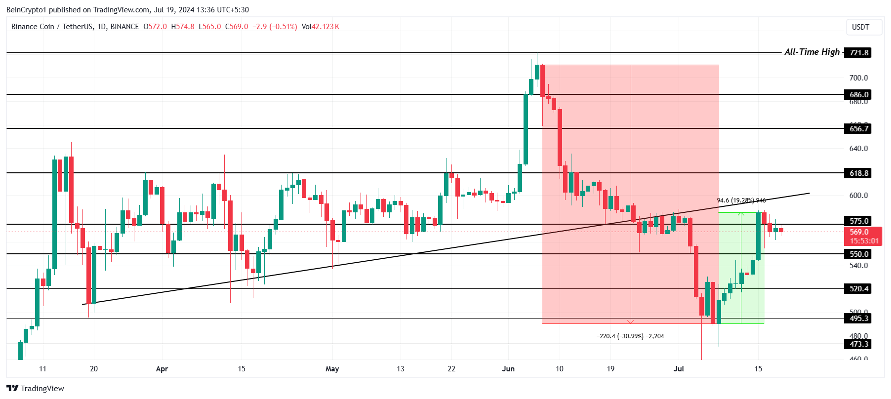 Il prezzo di BNB mira a recuperare il supporto della linea di tendenza al rialzo, che rappresenta la migliore possibilità di rialzo per l’altcoin. Il superamento dei 600 dollari come supporto darebbe anche slancio all’asset crittografico oltre la resistenza a 618 dollari.