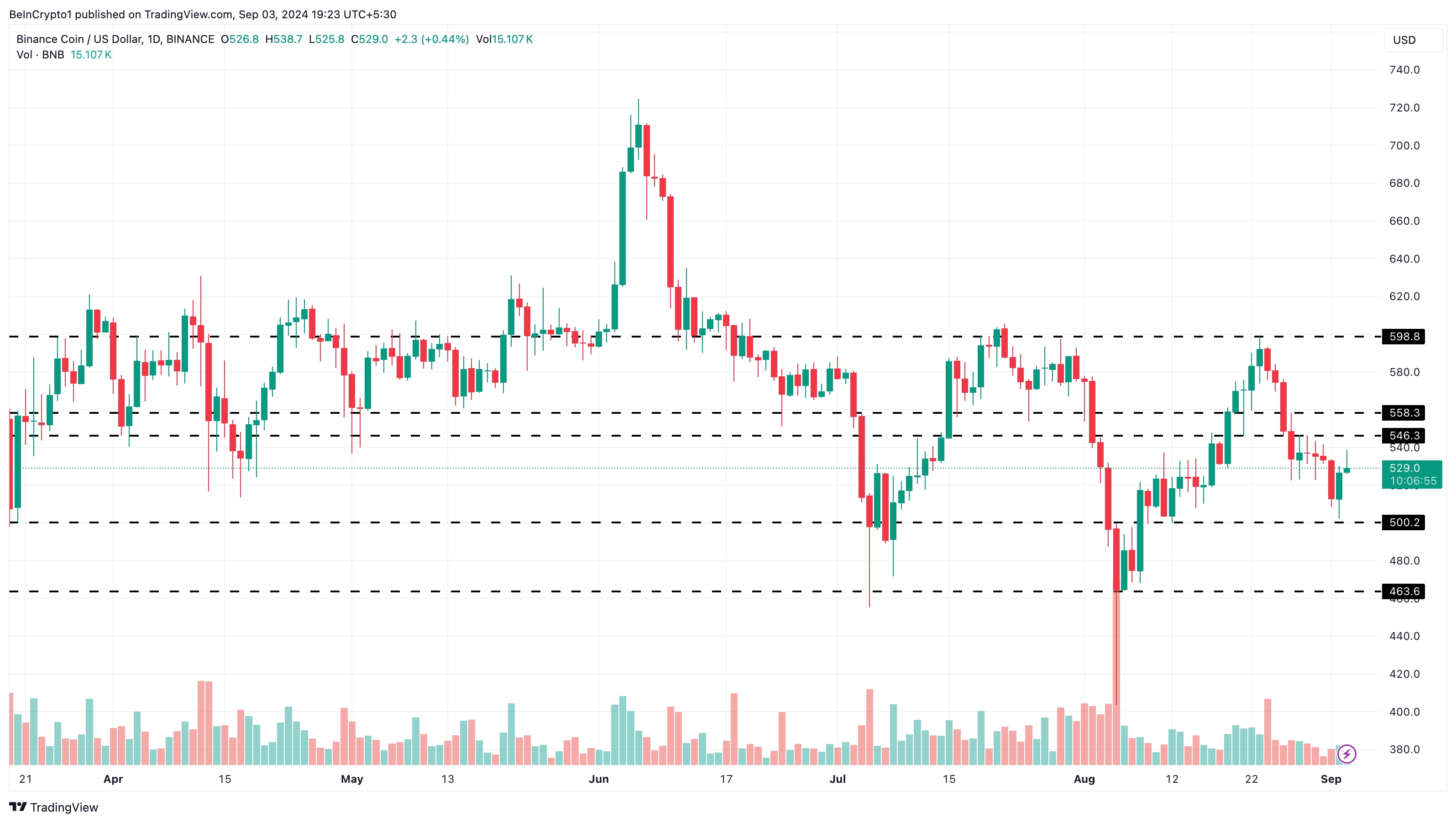 Dopo due candele verdi consecutive, il prezzo di Binance Coin (BNB) è ora vicino a un livello che potrebbe determinare la sua prossima mossa importante. Il 1° settembre, il token nativo della BNB Chain era vicino a scendere sotto i 500 USD.