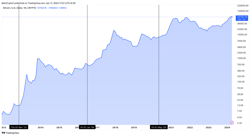 Storicamente, il Bitcoin ha registrato notevoli aumenti di prezzo in seguito a eventi di dimezzamento, anche se non immediatamente. Hannah Phung, Lead Data Analyst di SpotOnChain, ha dichiarato a BeInCrypto che gli aumenti di prezzo tendono a verificarsi da 6 a 12 mesi dopo il dimezzamento.