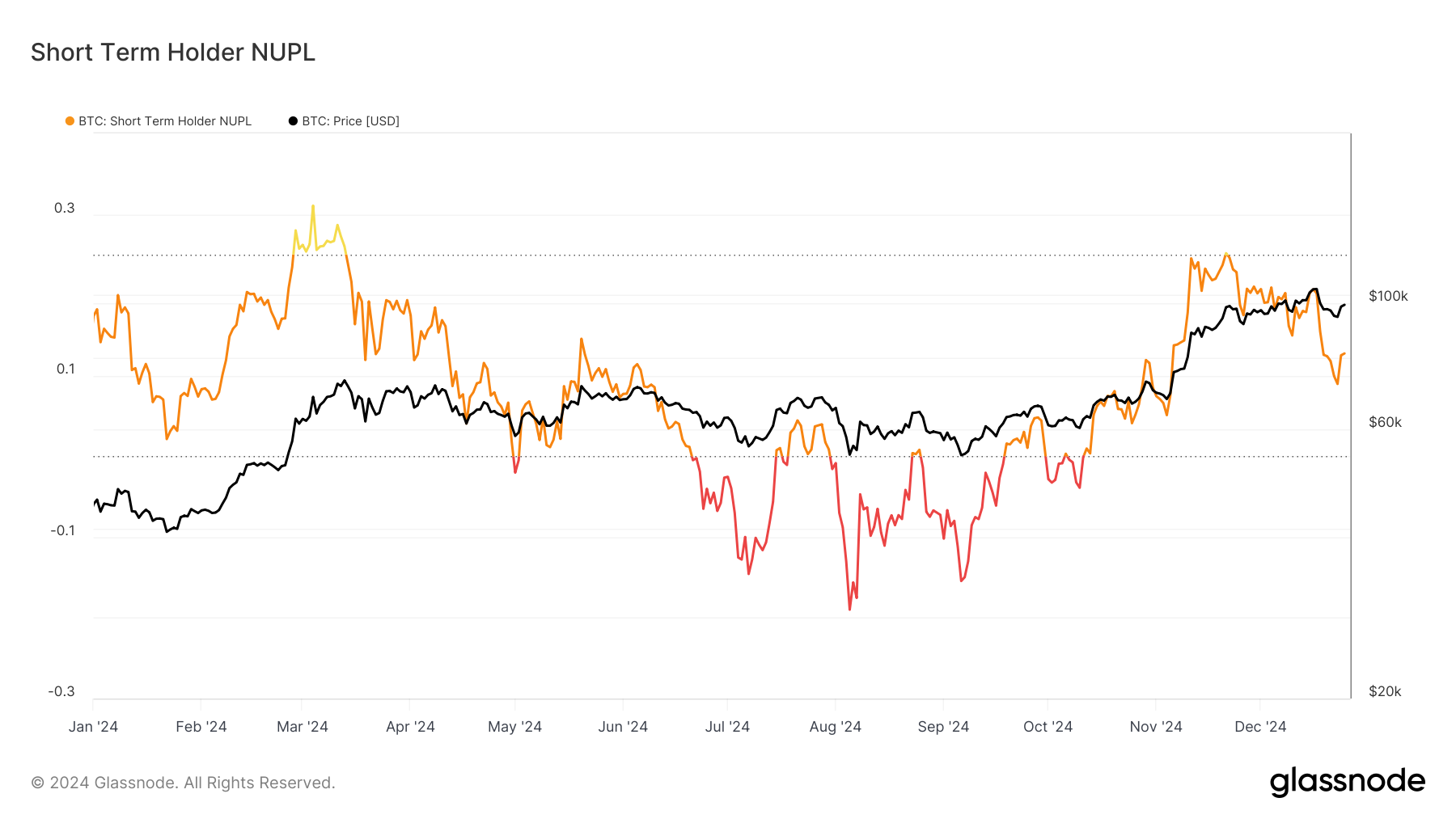 Un altro indicatore che rafforza questo sentimento è il Short-Term Holder- Net Unrealized Profit/Loss (STH-NUPL). Lo STH-NUPL misura il comportamento degli investitori che hanno detenuto una moneta per meno di 155 giorni.