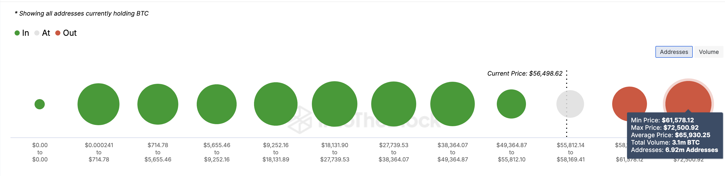 Oltre a questa base di costo on-chain, l’indicatore Globale di Entrata/Uscita di Denaro (GIOM) mostra che Bitcoin potrebbe incontrare una resistenza significativa tra 61.578 USD e 72.500 USD se il prezzo tenta di raggiungere questi livelli. Qui, 6,92 milioni di indirizzi hanno accumulato 3,1 milioni di BTC.