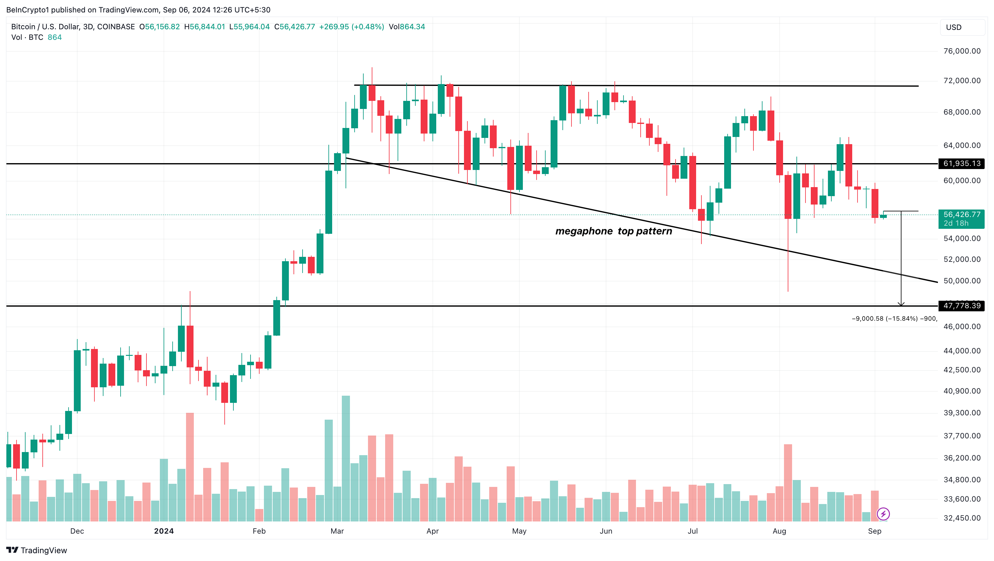 Da un punto di vista tecnico, il grafico tri-giornaliero di Bitcoin conferma il pregiudizio ribassista. Basato sul grafico, BTC ha formato un modello di cima a megafono, che appare quando il prezzo raggiunge tre massimi più alti e due minimi più bassi.