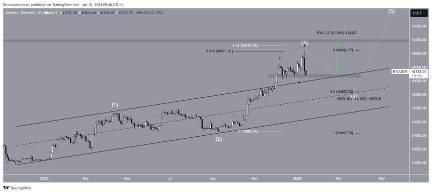 Il BTC scambia attualmente all’interno dell’area di supporto orizzontale di 41.500 dollari. Una rottura di quest’area confermerà l’inizio dell’onda quattro e potrebbe portare a un calo del 14% fino al livello di supporto del ritracciamento dello 0,5 Fib a 36.800 dollari, che coincide con la parte centrale del canale a lungo termine.