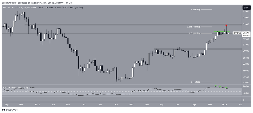 Il movimento al rialzo ha portato a un massimo di 49.000 dollari l’11 gennaio, un giorno dopo l’approvazione del Bitcoin ETF. Ciò ha causato un breakout al di sopra di un’importante area di resistenza orizzontale e Fib.