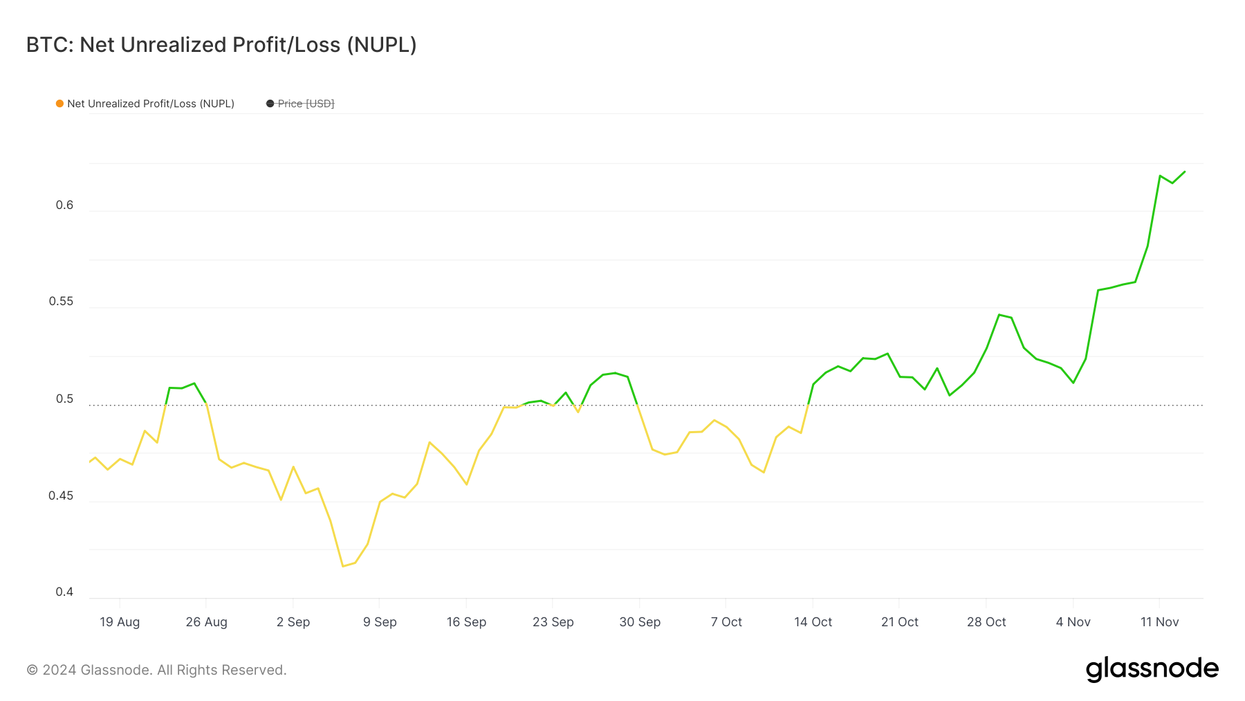 Il prezzo di BTC è anche circa il 10% sotto il storico segno dei 100.000 USD, e, data la forza attuale del trend e metriche di supporto come NUPL, raggiungere questo traguardo sembra possibile nel prossimo futuro. Tuttavia, correzioni sono sempre possibili prima che si stabilisca un nuovo massimo storico.
